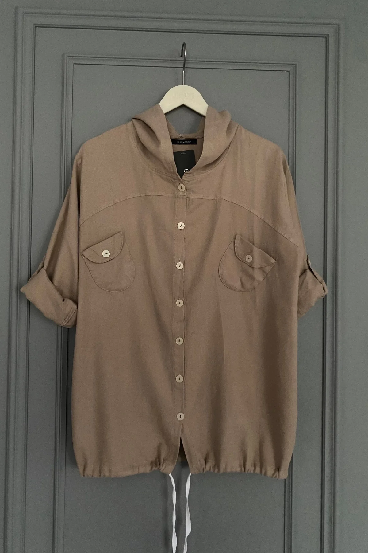 Kadın BEJ rengi Omzu Ve Cebi FİLE DETAYLI Yıkamalı Keten Kumaş Kısa Kol Buluz Gömlek