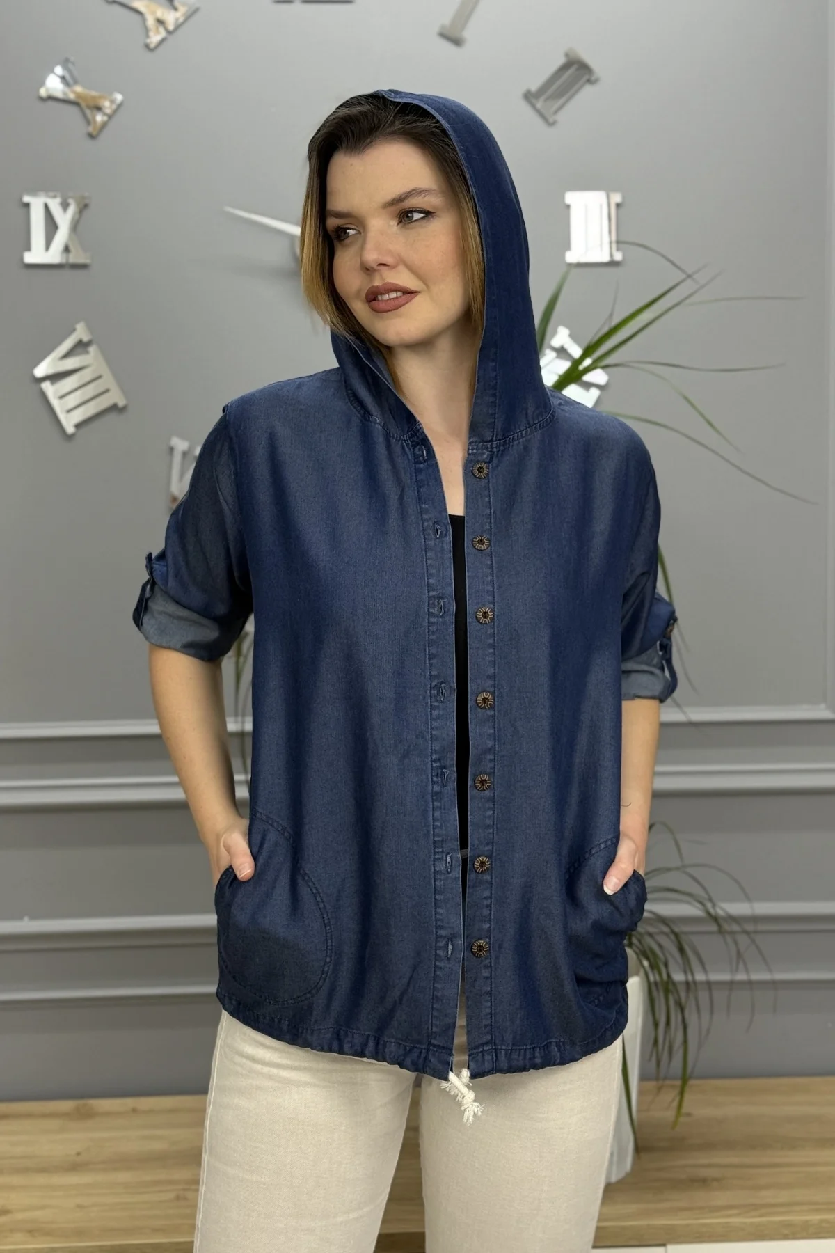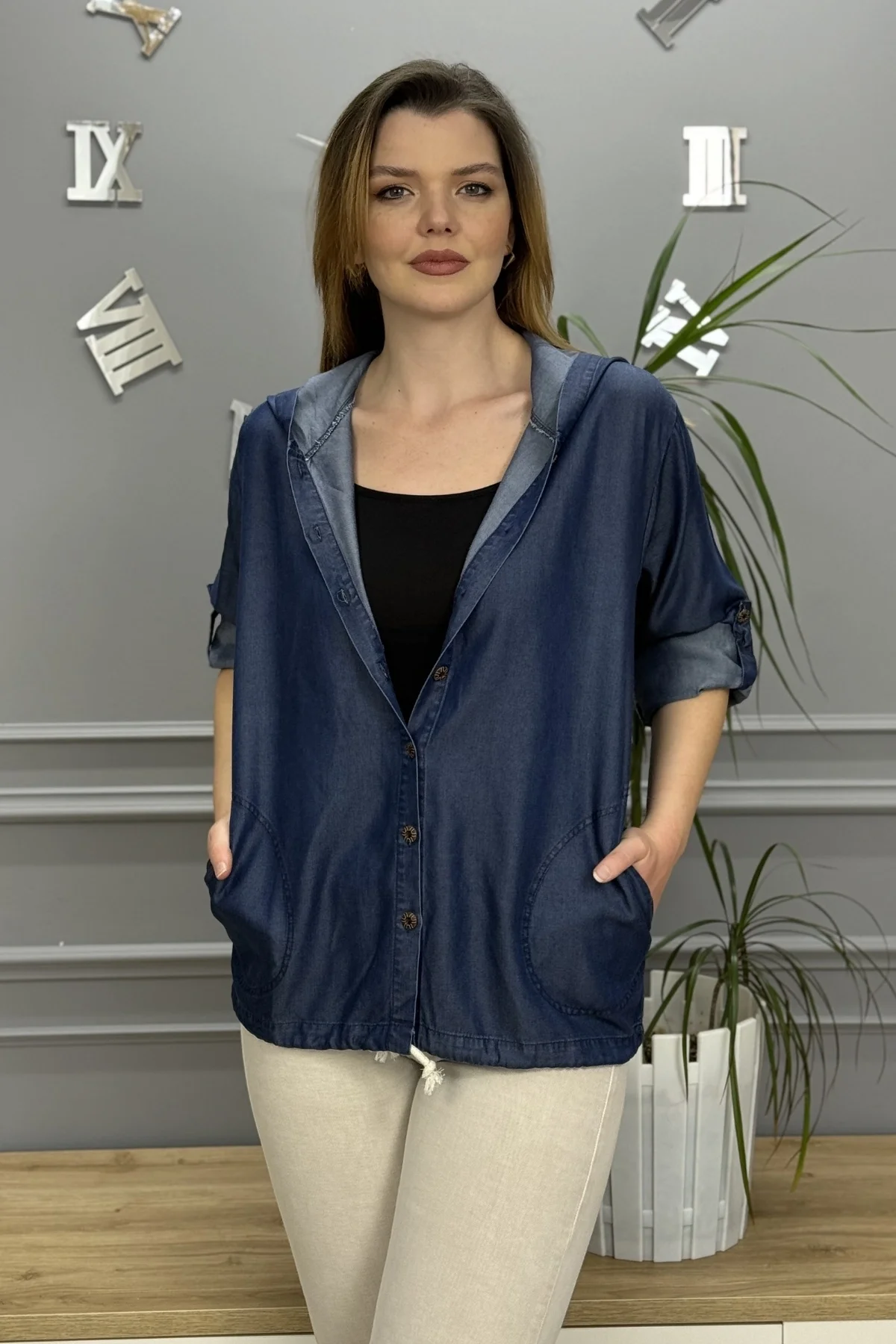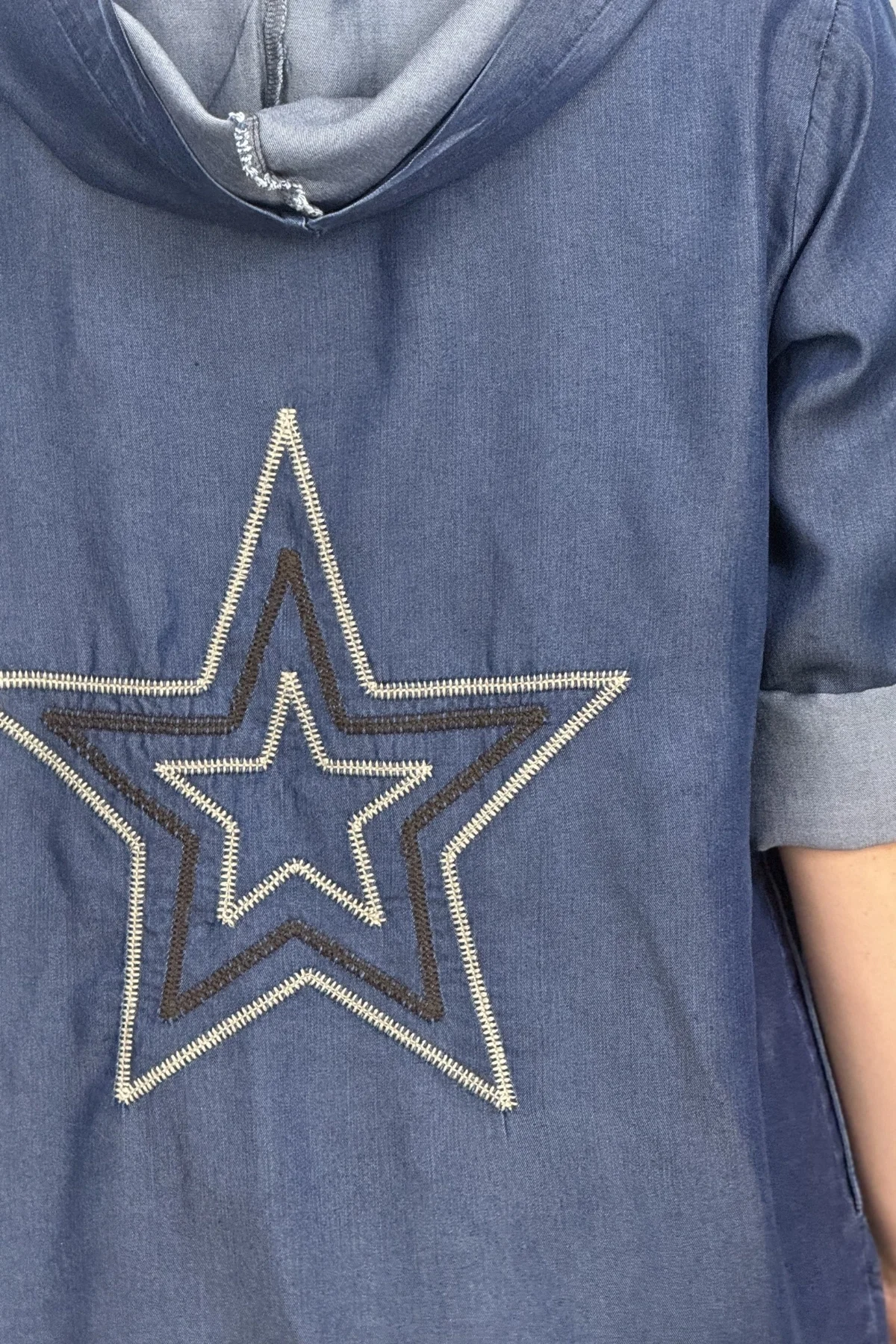 Kadın Koyu Mavi TENSEL Sırtı Yıldız Nakışlı Kapüşonlu Cepli Eteği Kordonlu KOT Gömlek Ceket