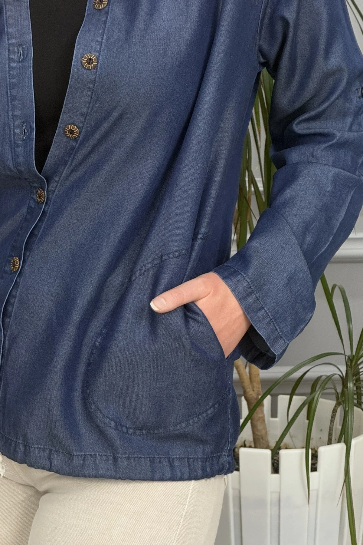 Kadın Mavi Yıkamalı Organik Pamuk Keten Kumaş Omuz Ve Cebi File Detaylı Dirsek Kol TUNİK Gömlek