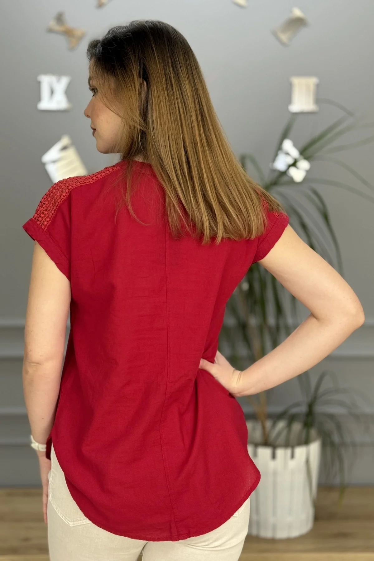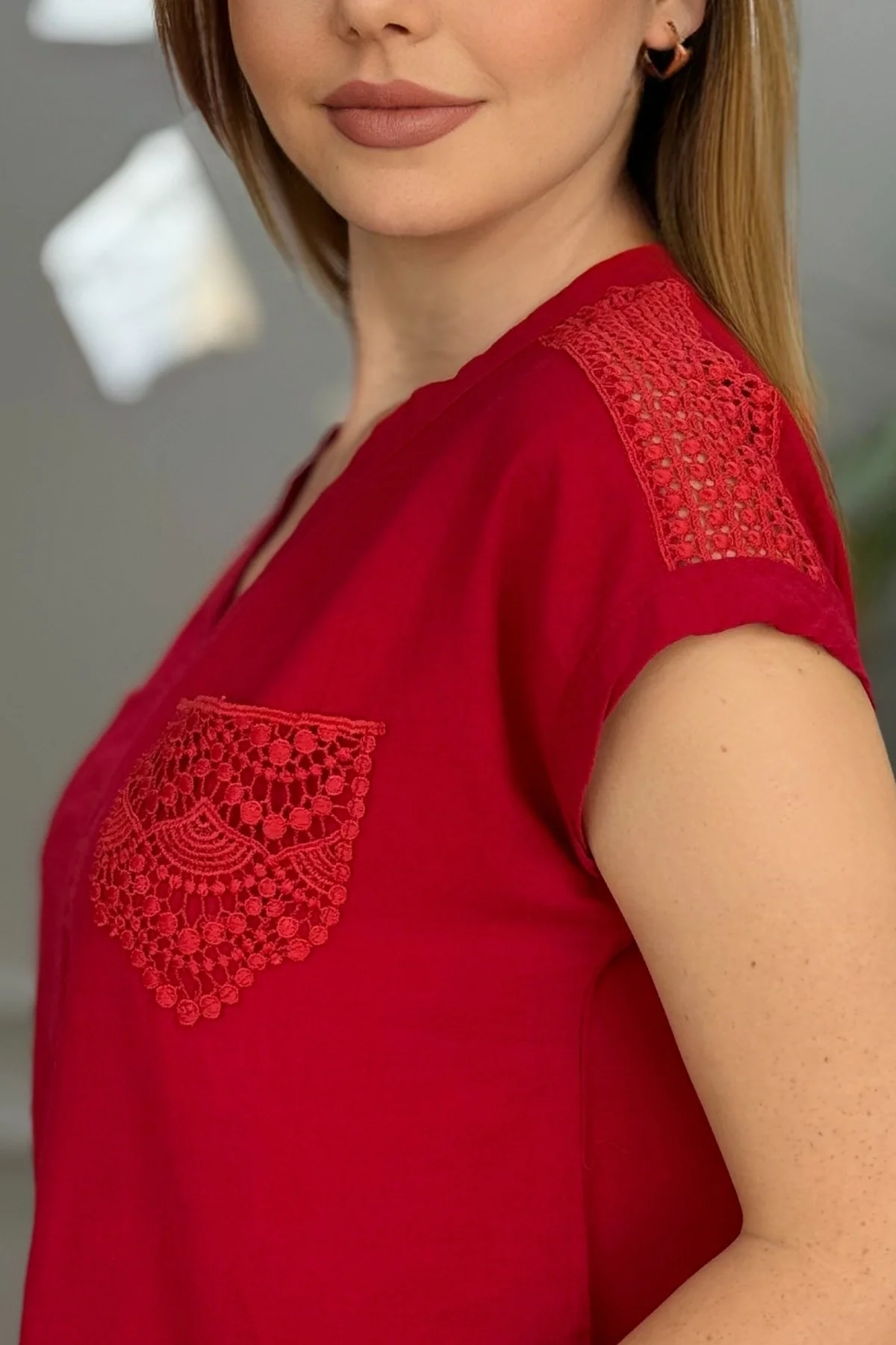 Kadın Kırmızı rengi Omzu Ve Cebi Güpürlü Keten Kumaş Kısa Kol Buluz Gömlek