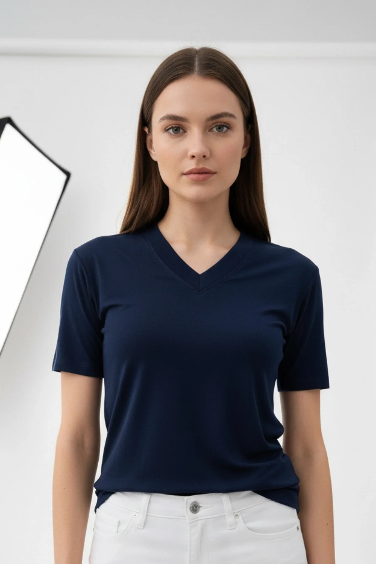 Kadın Lacivert V Yaka Kısa Kol Likralı Pamuk Vizkon Kumaş Bluz