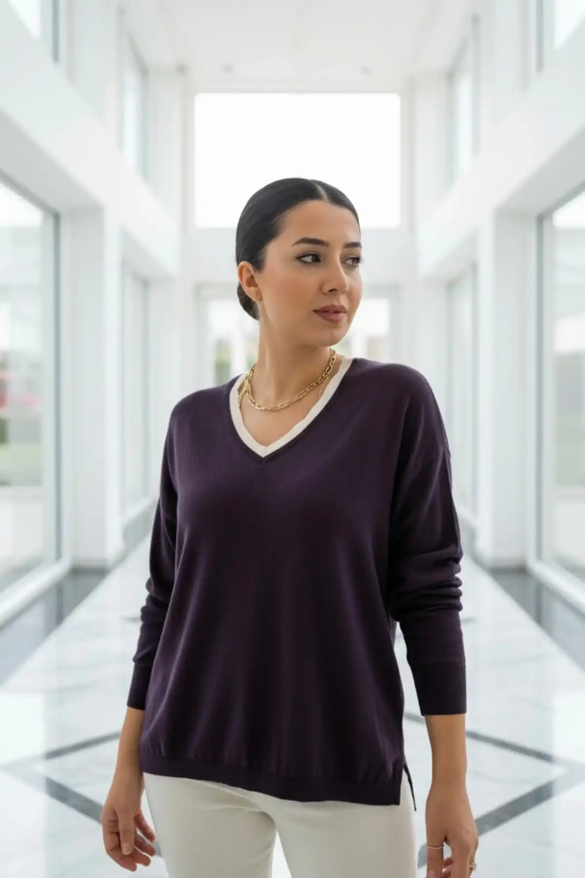 Kadın Mürdüm V Yaka Yakası Çift Renkli Pamuk Örgü Likarlı İnce Triko Buluz