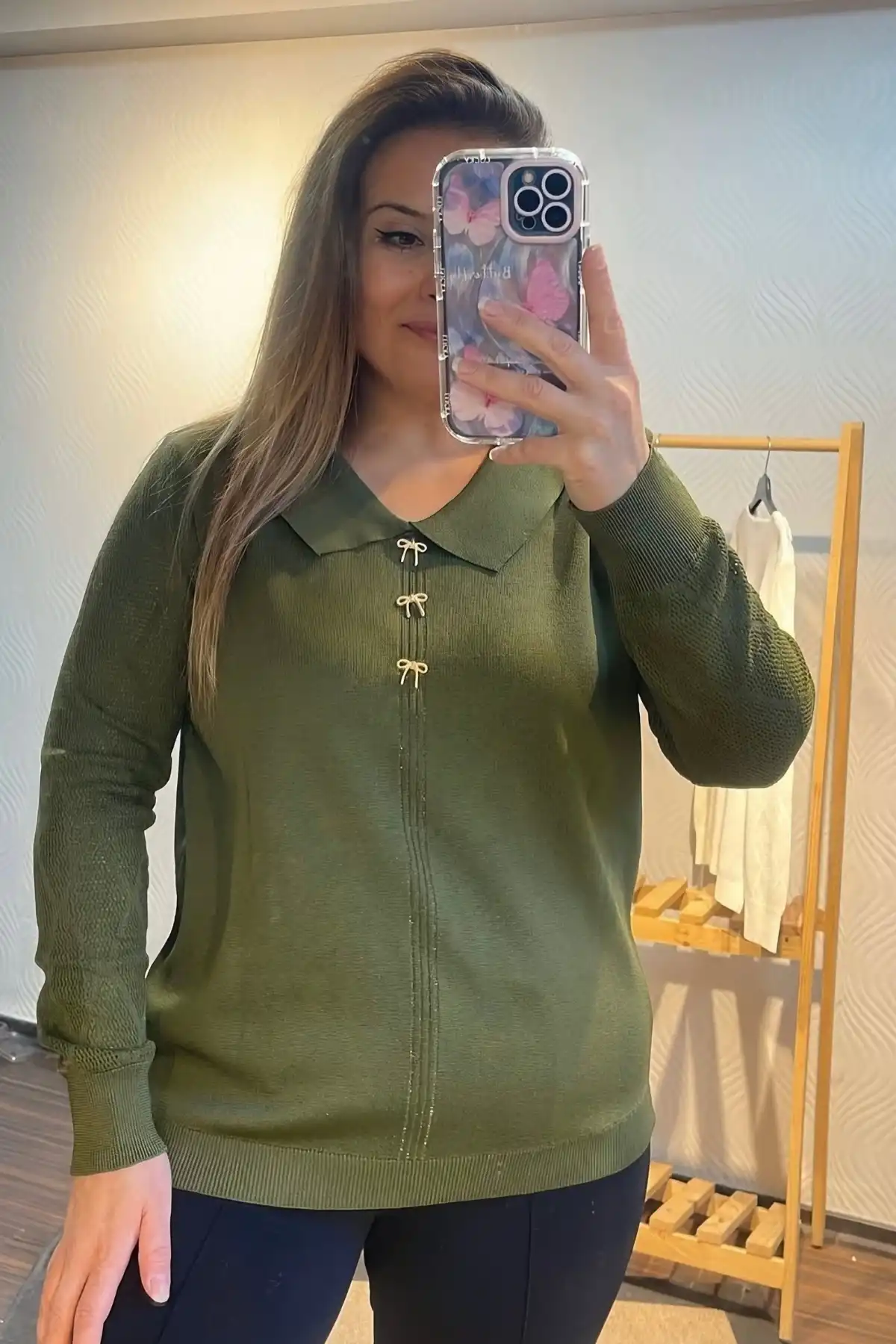 Kadın Haki Yeşil Bebe Yakalı Kollar Ajurlu Fileli Simli Likralı Yumuşak Dokulu İnce Tiriko Kazak