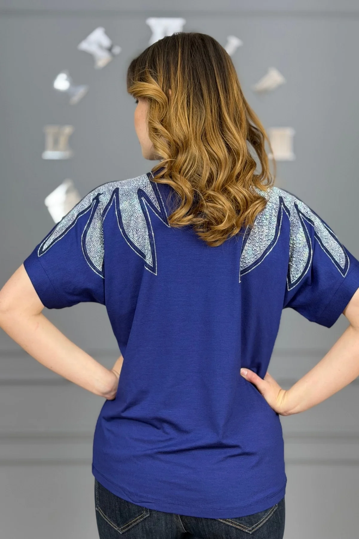 Kadın Lacivert Büyük Beden V Yaka Omuzlar Yaprak Kristal Taş İşlemeli Likralı Kısa Kol Buluz