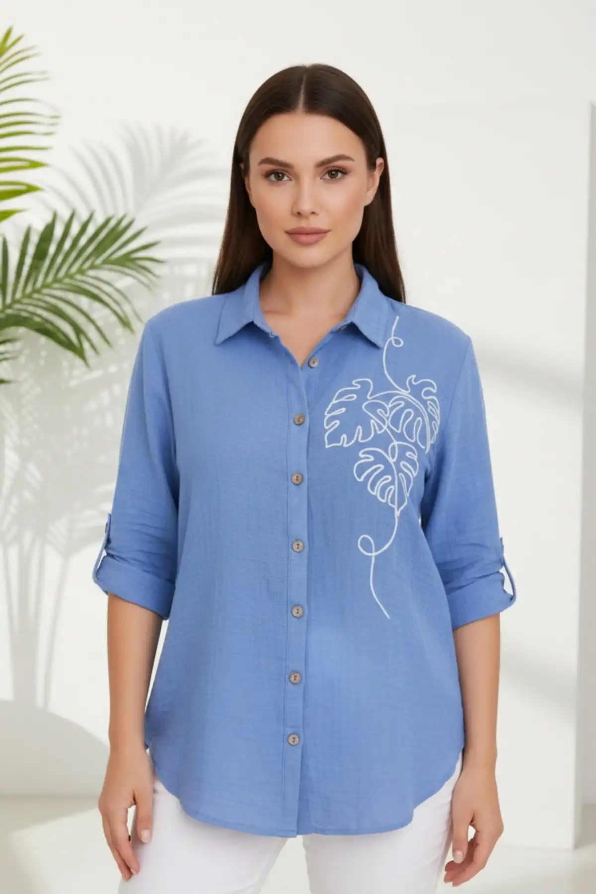 Kadın Mavi Göğsü Nakış Detaylı Müslin Kumaş Kol Katlamalı Gömlek