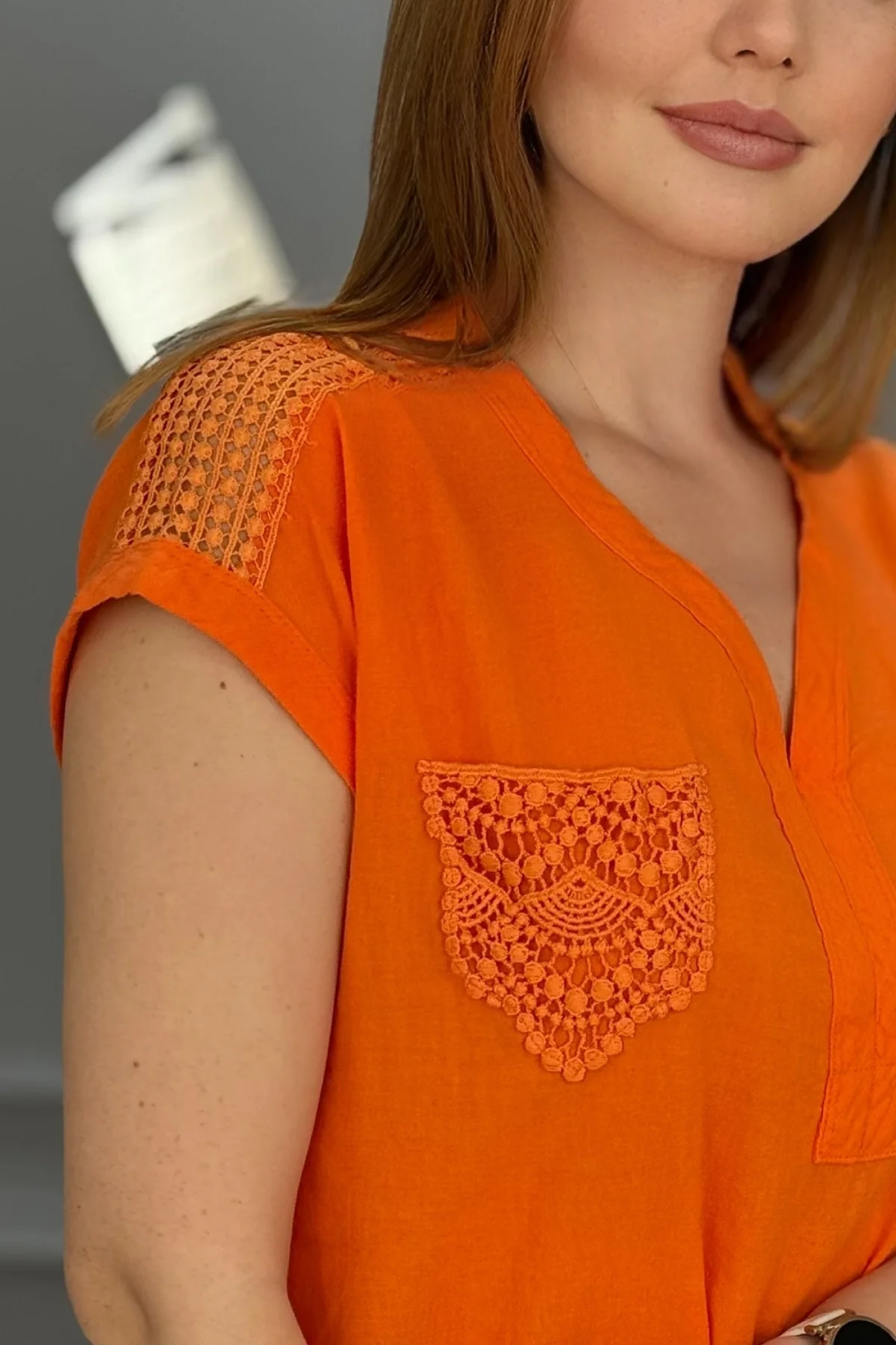 Kadın Turuncu Omzu Ve Cebi Güpürlü Keten Kumaş Kısa Kol Buluz Gömlek