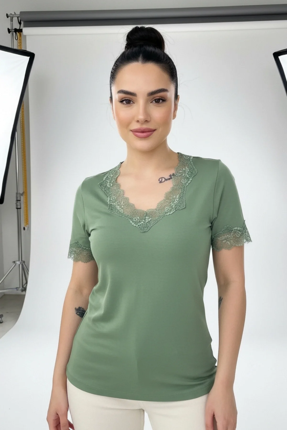 Kadın YEŞİL V Yaka Yakası Ve Kol Ucu Dantelli Likralı Esnek Kısa Kol Bluz