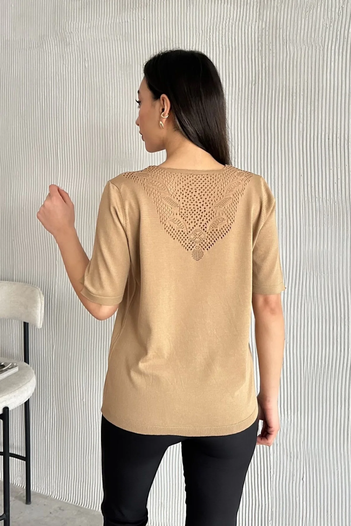 Kadın Kahve V Yaka Yakası Sim Detaylı Soğuk İplik Yazlık İnce Merserize Buluz