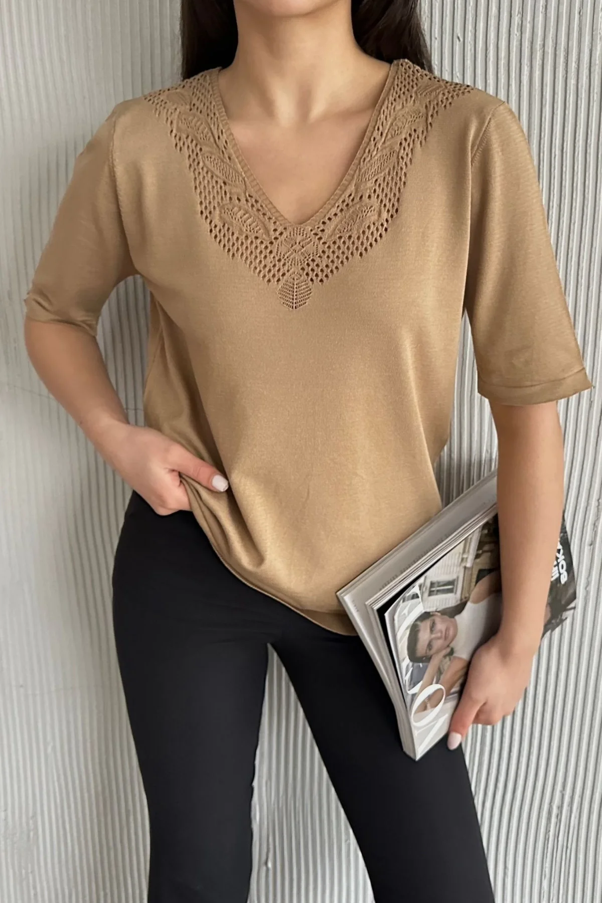 Kadın Kahve V Yaka Likralı Dışı Simli İçi Yumoş İnce Triko Bluz