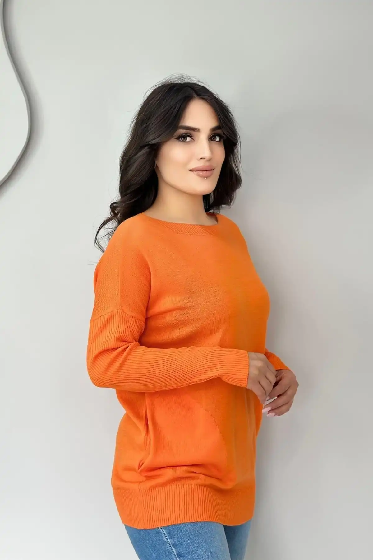 Kadın TURUNCU Bisiklet Yaka Yandan Cepli Likralı Yumuşak Dokulu İnce Tiriko Kazak