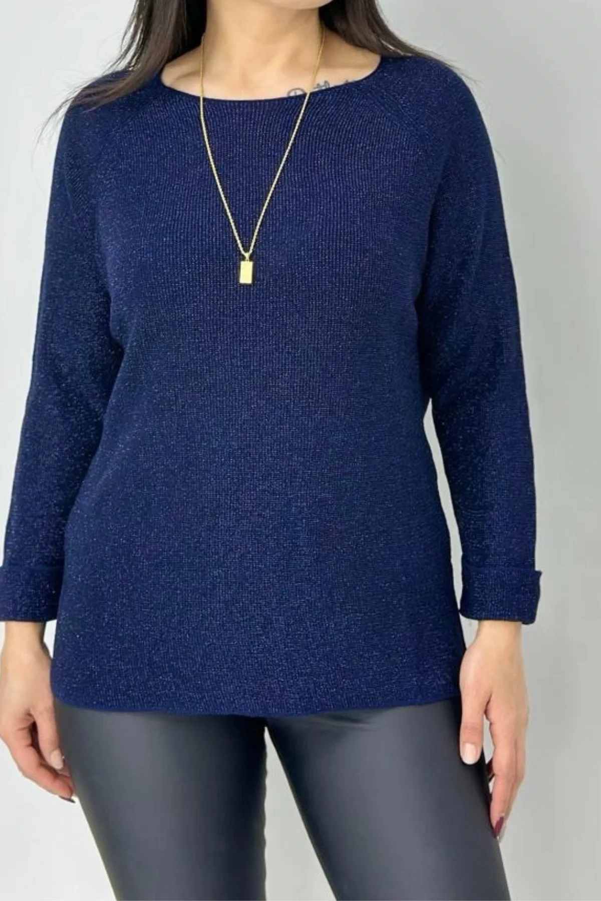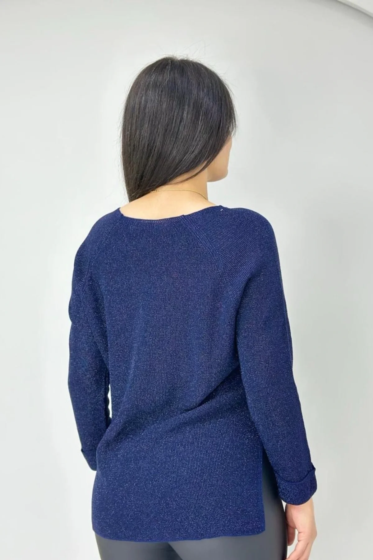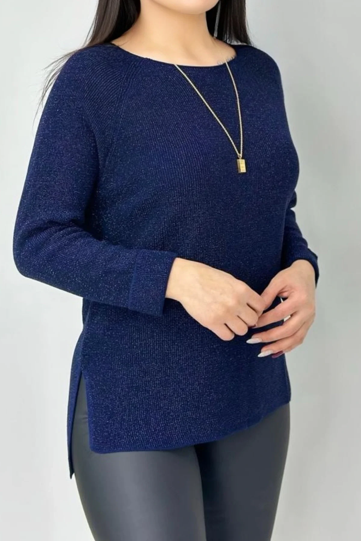 Kadın LACİVERT Bisiklet Yaka Yandan Cepli Likralı Yumuşak Dokulu İnce Tiriko Kazak