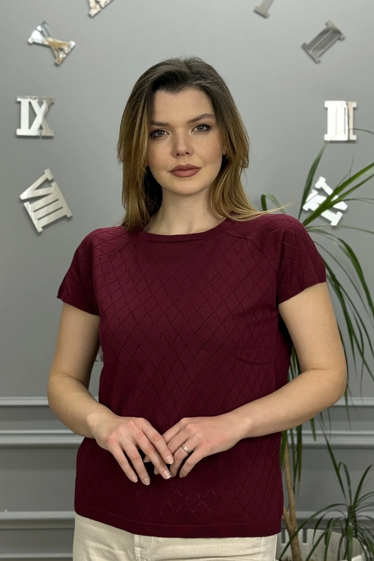 Kadın Büyük Beden BORDO Bisiklet Yaka Baklava Desenli Likralı Soğuk İplik Örgü İnce Triko Bluz