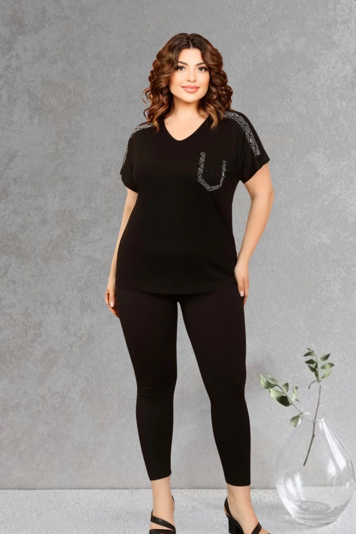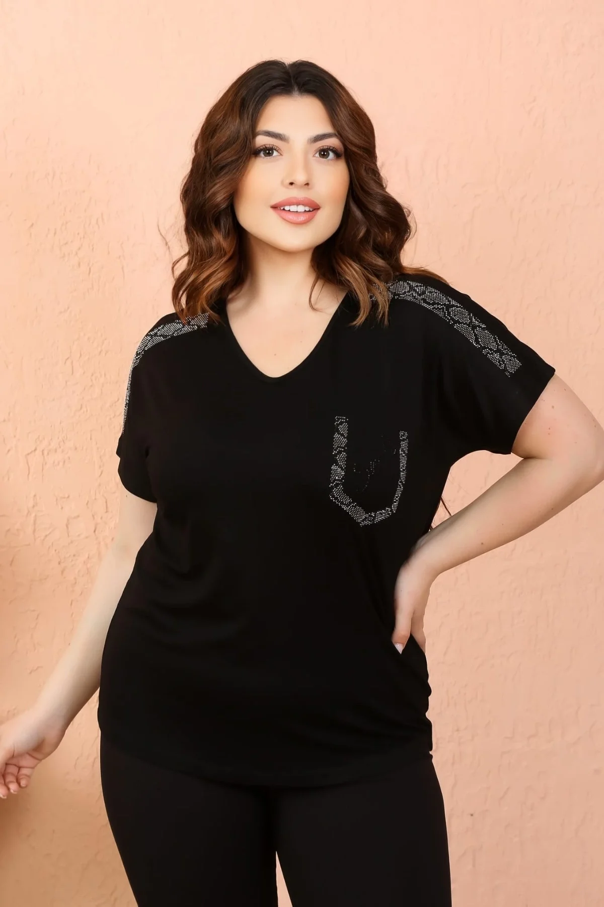 Kadın Büyük Beden Siyah Omuz Kristal Taşlı Likralı Bluz