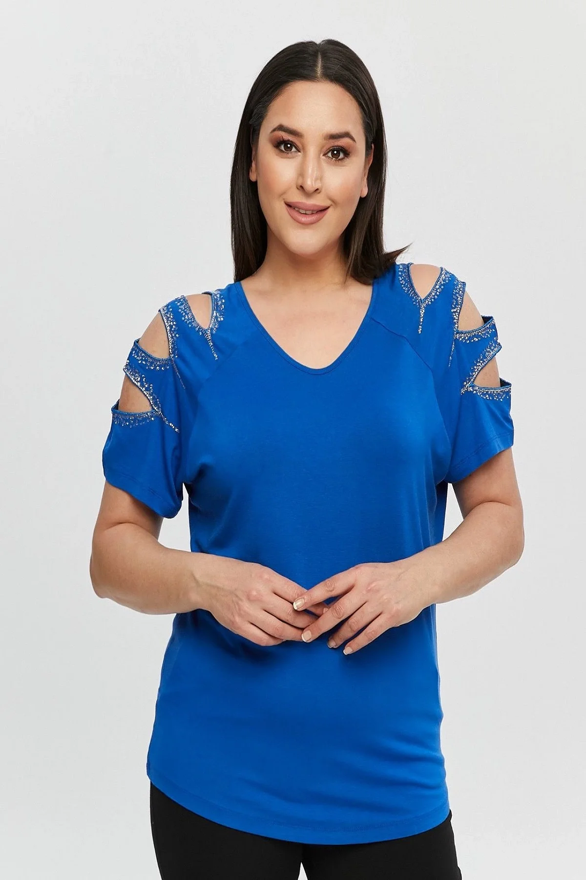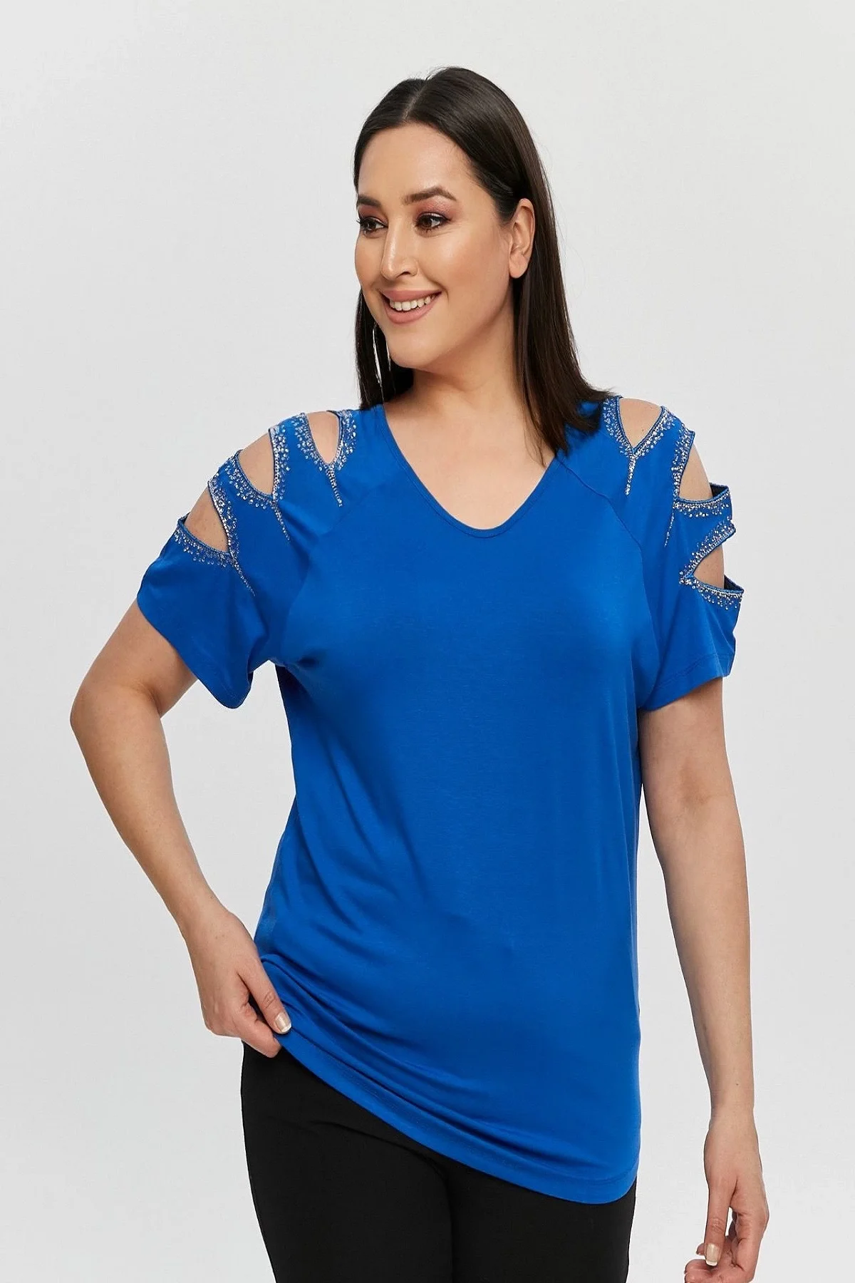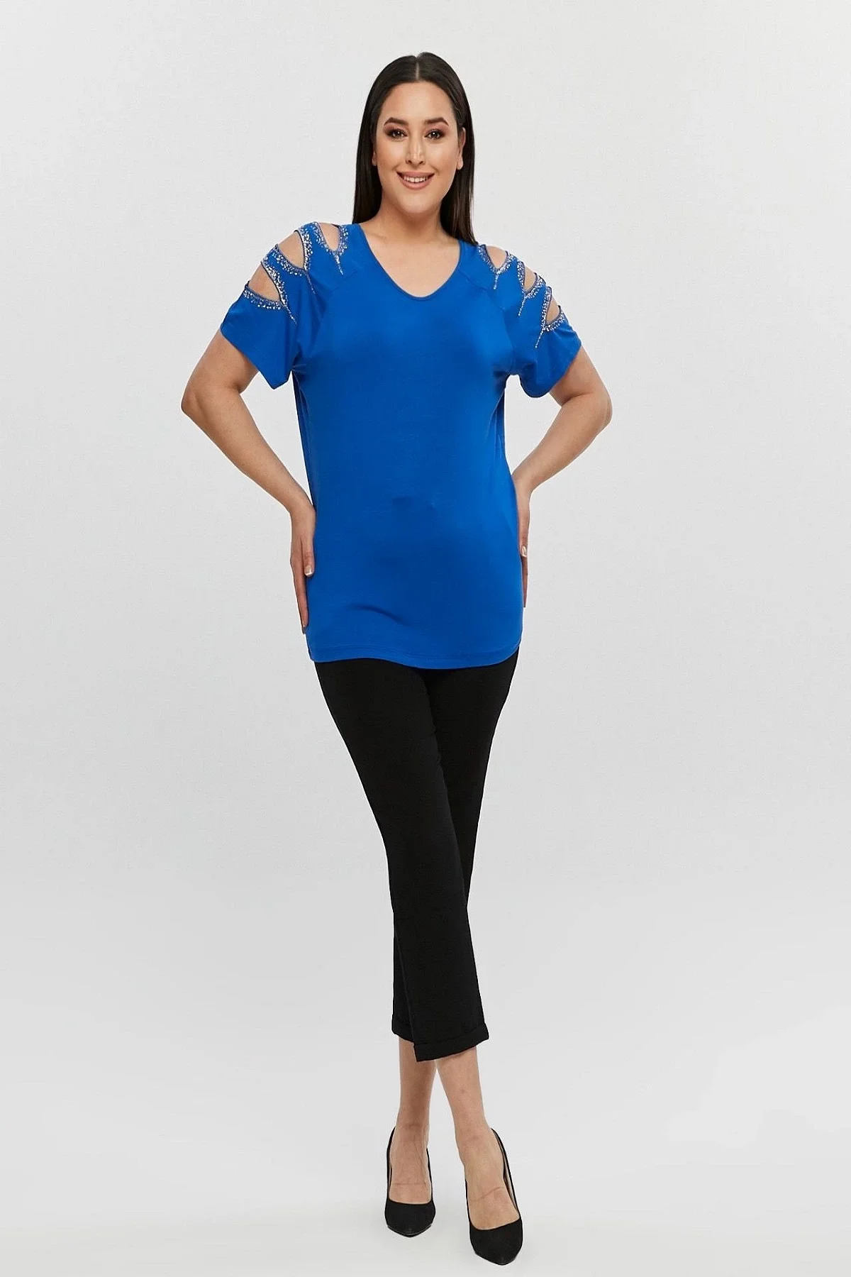 Kadın Büyük Beden Mavi ÖN ARKA V Yaka Omuz Dekolteli Pul İşlemeli Likralı Bluz
