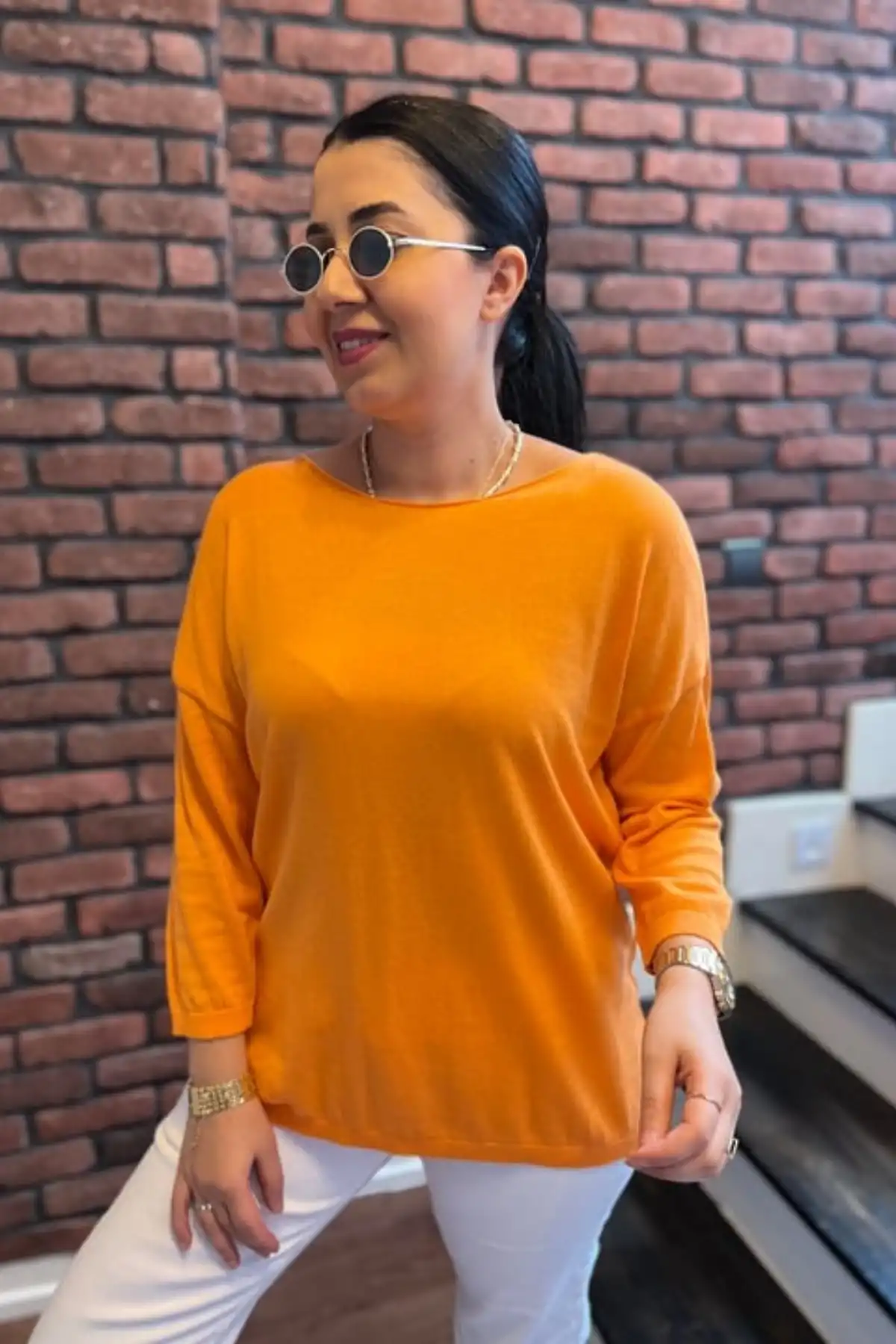 Kadın Turuncu Kayık Yaka Likralı PAMUK İPLİK İnce Triko Bluz