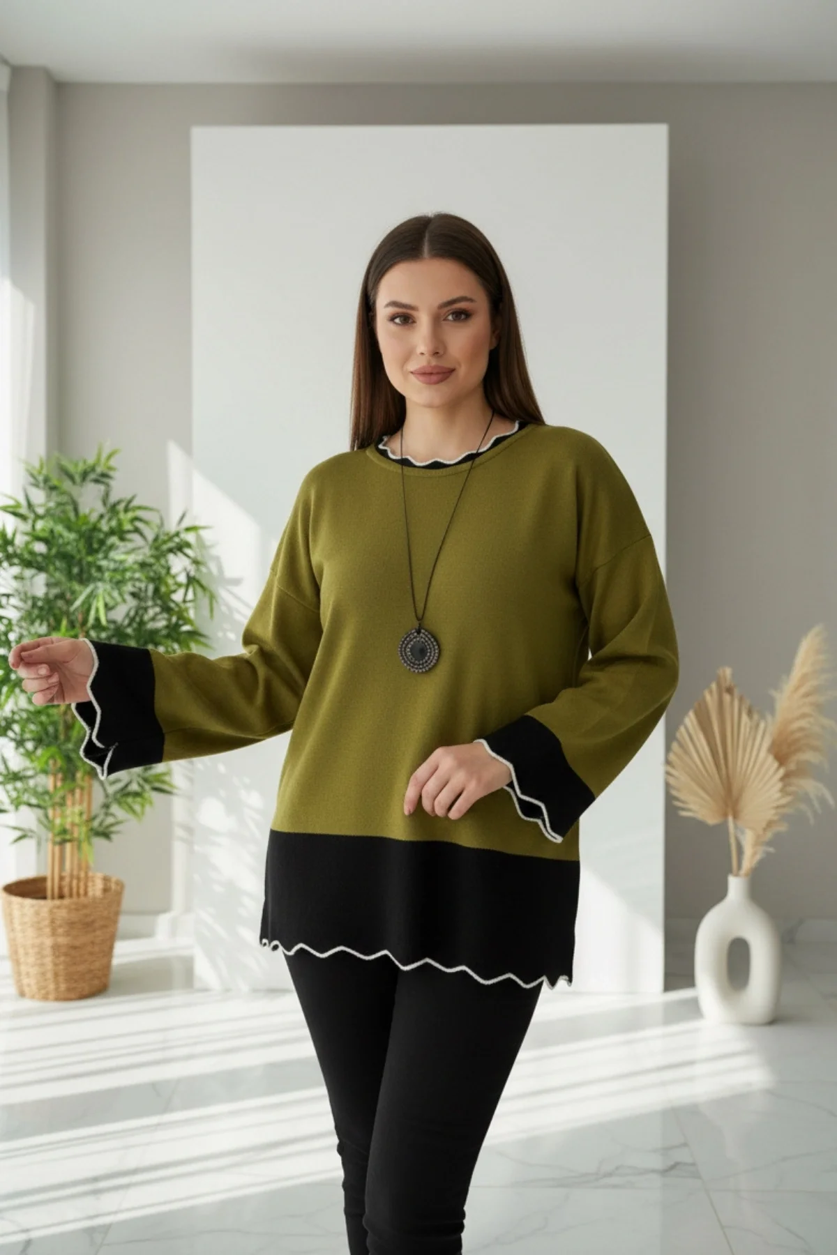 Kadın Yağ Yeşili Bisiklet Yaka Etek Ve Kol Ucu Garnili Biyeli SİMLİ Likralı İnce Tiriko