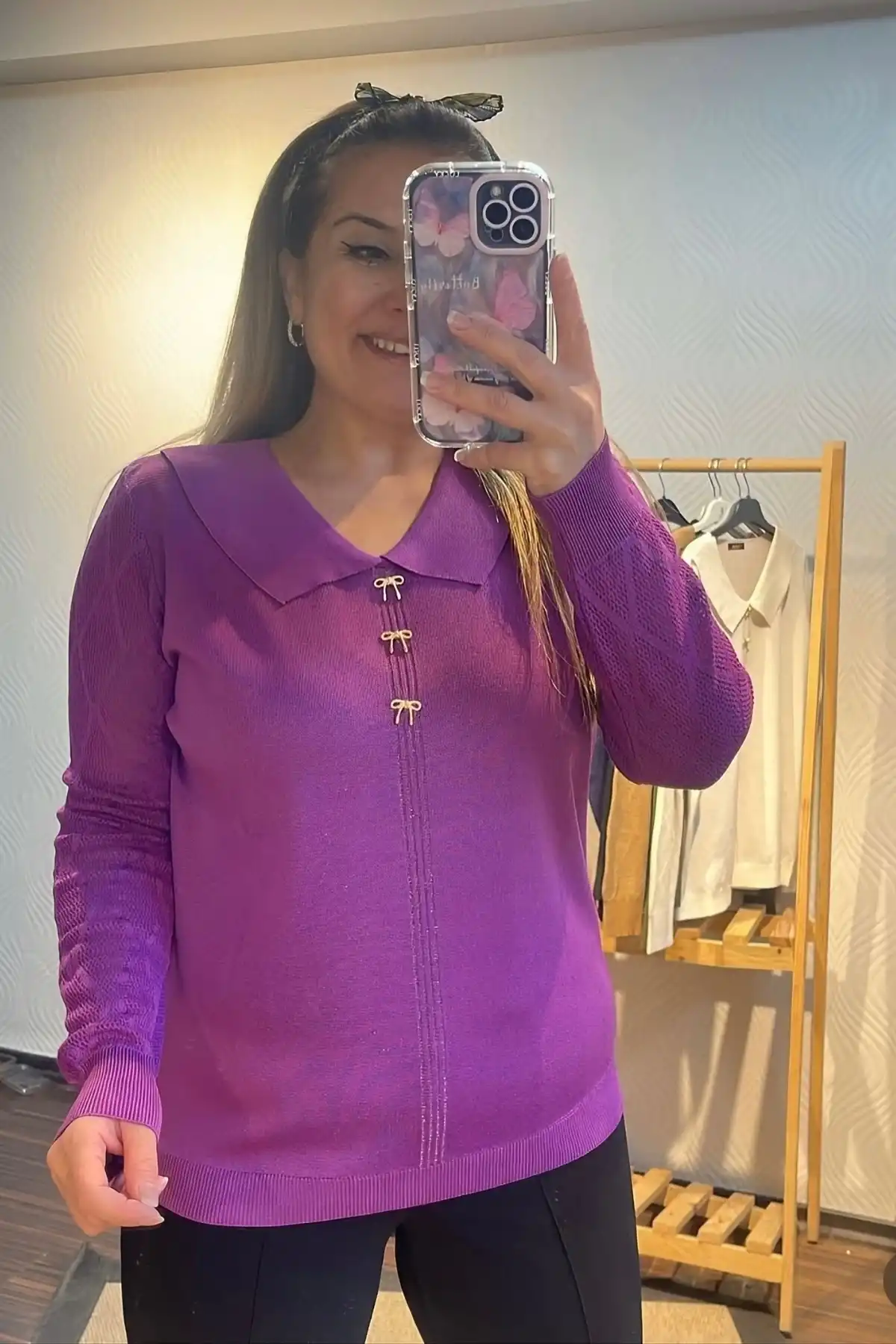 Kadın Mor Bebe Yakalı Kollar Ajurlu Fileli Simli Likralı Yumuşak Dokulu İnce Tiriko Kazak