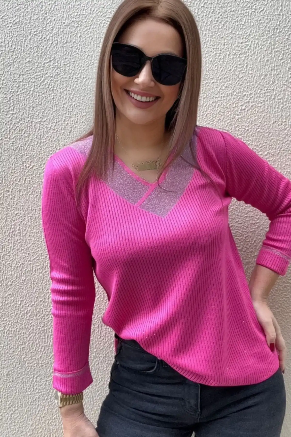 Kadın Pembe V Yaka Yakası Manşetli Simli Likralı Soğuk İplik Triko Bluz
