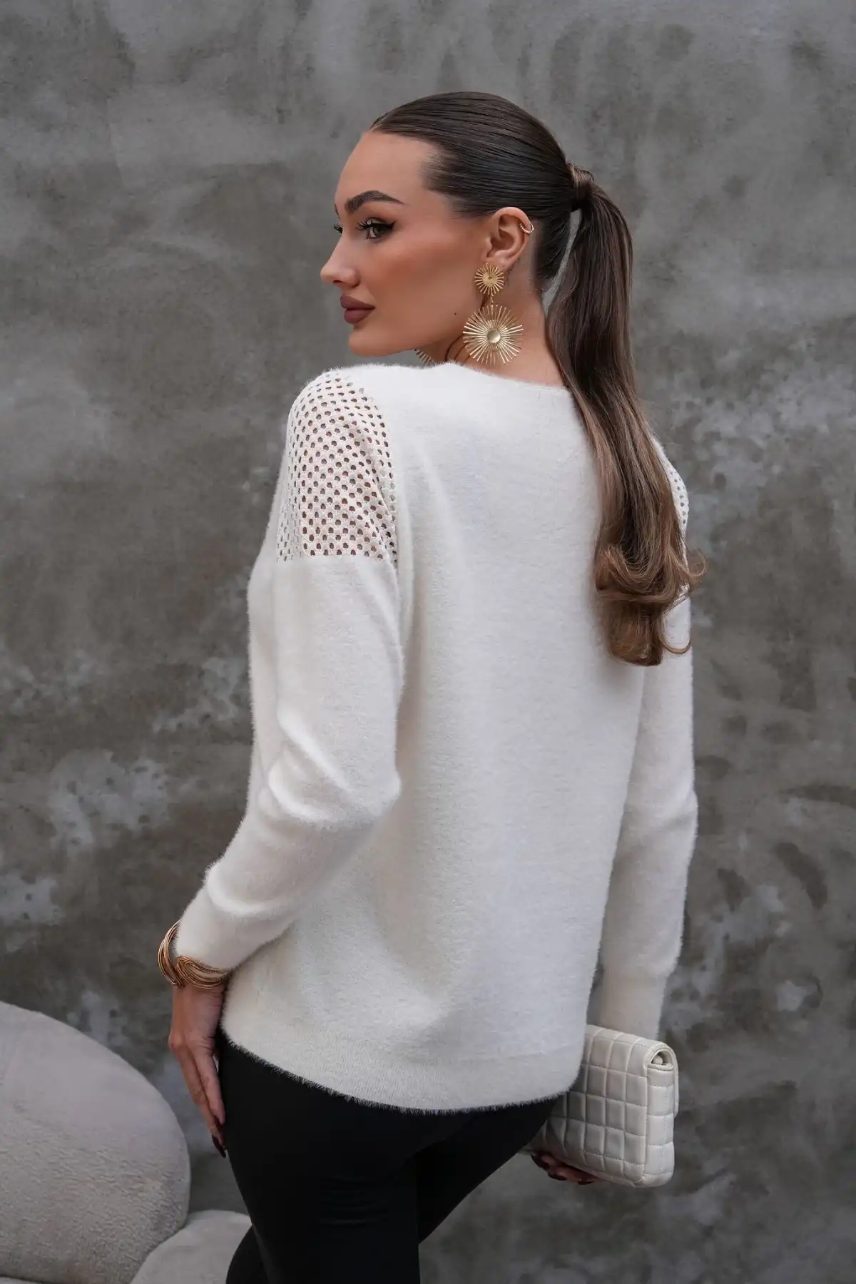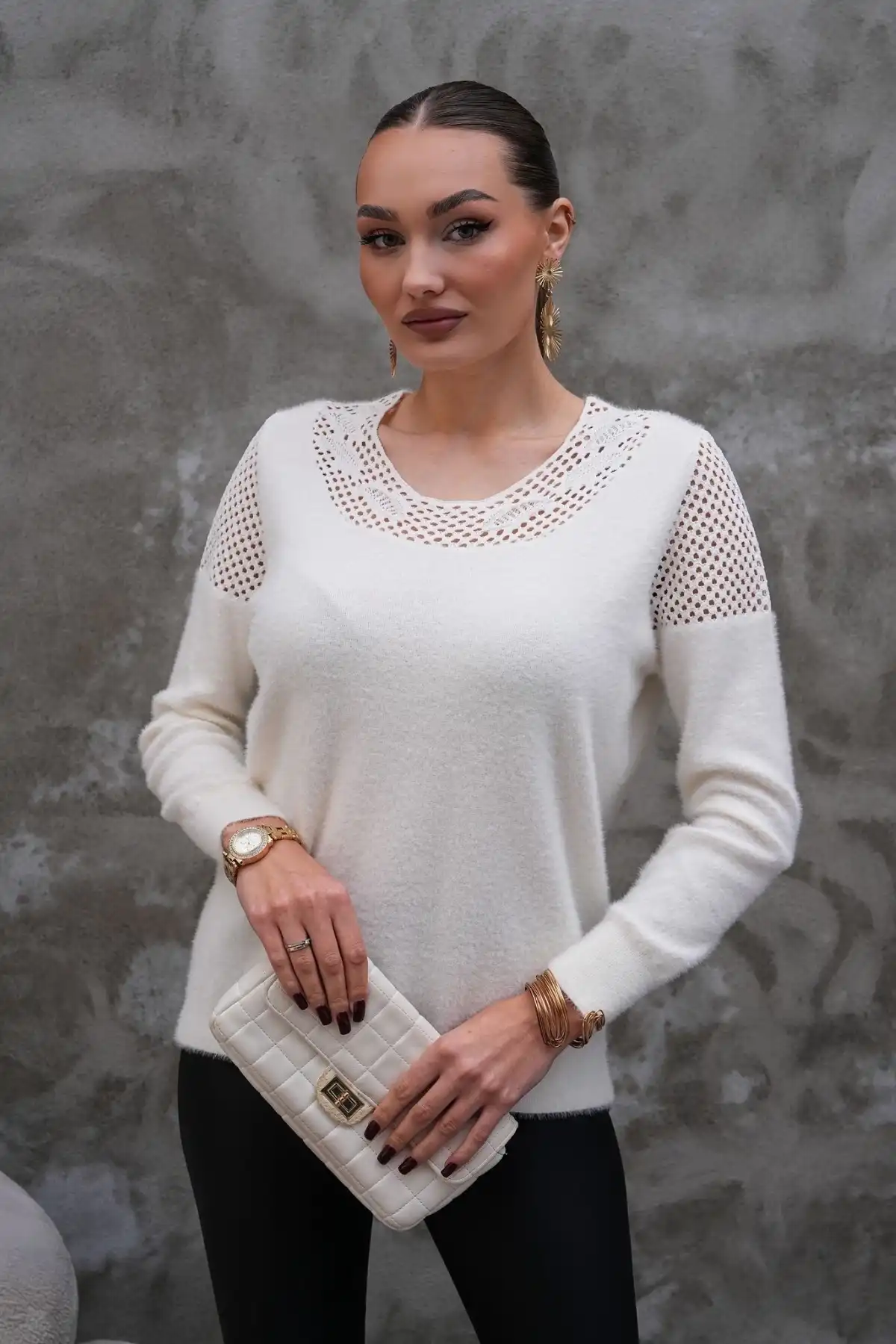 Kadın Beyaz Yumoş Tiriko Sakal İp Örgü Likralı Yaka Ve Omuz File Detaylı Liralı Kazak