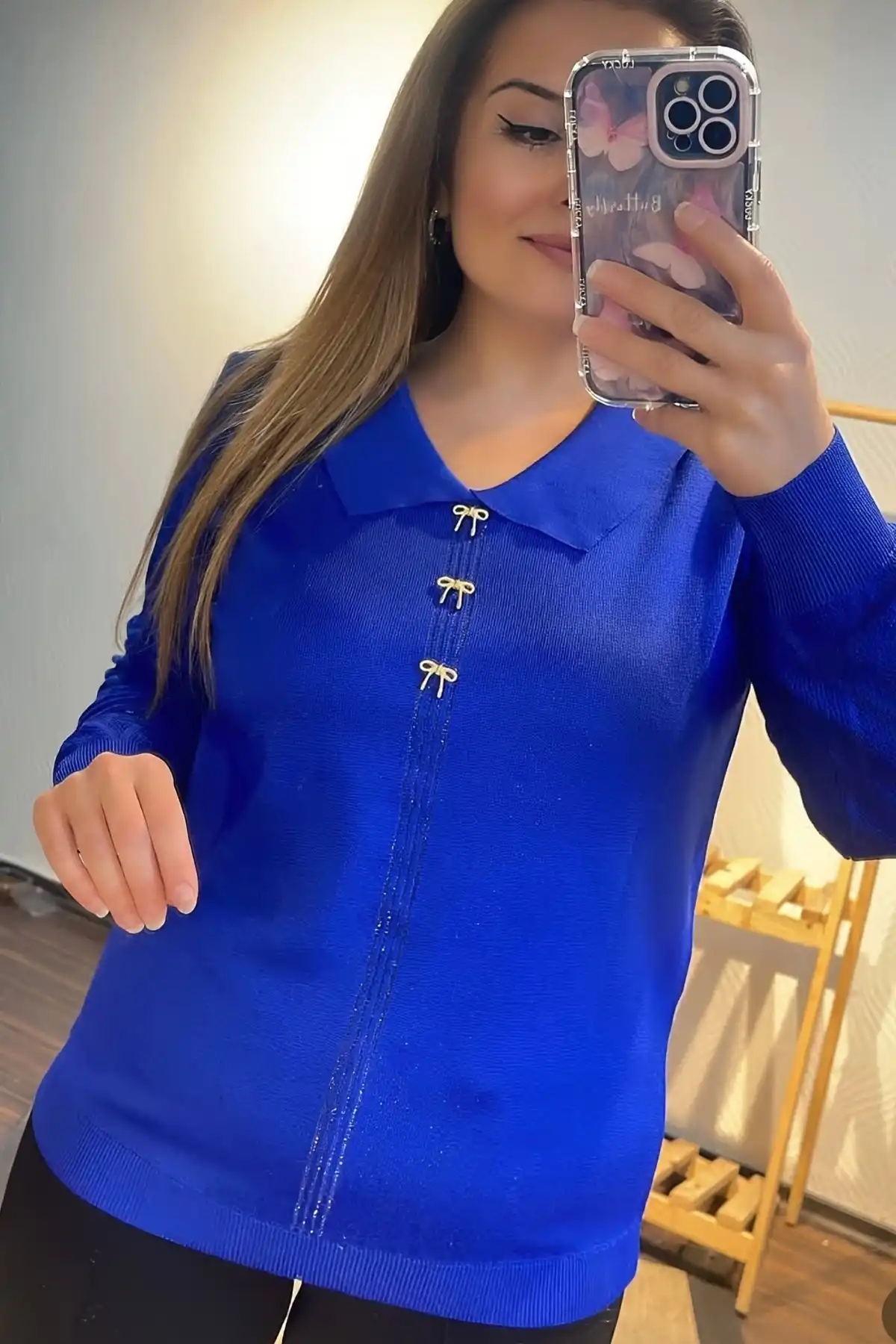 Kadın Mavi Bebe Yakalı Kollar Ajurlu Fileli Simli Likralı Yumuşak Dokulu İnce Tiriko Kazak