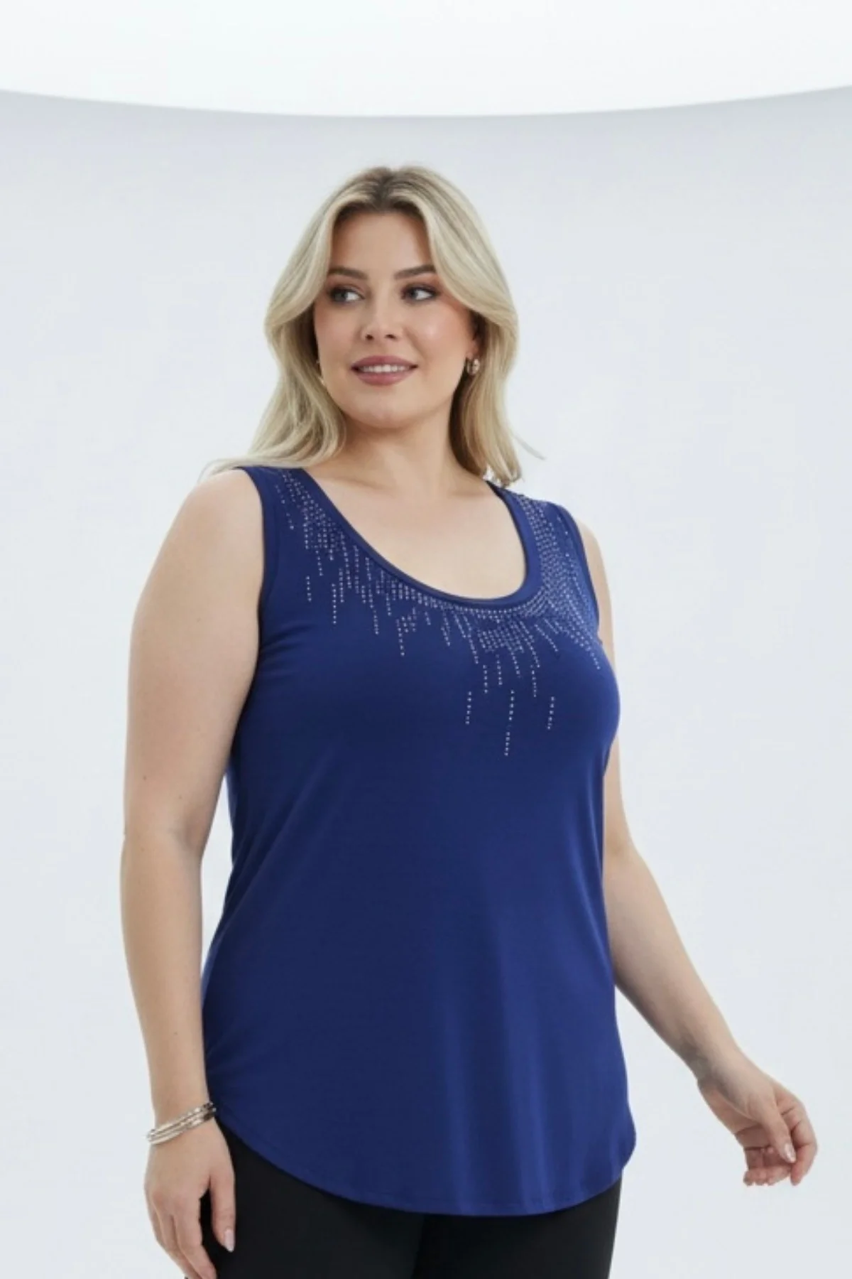 Kadın Lacivert U Yaka Büyük Beden Yakası Taş İşlemeli Likralı Buluz