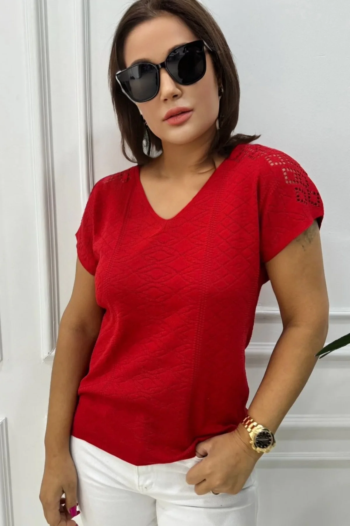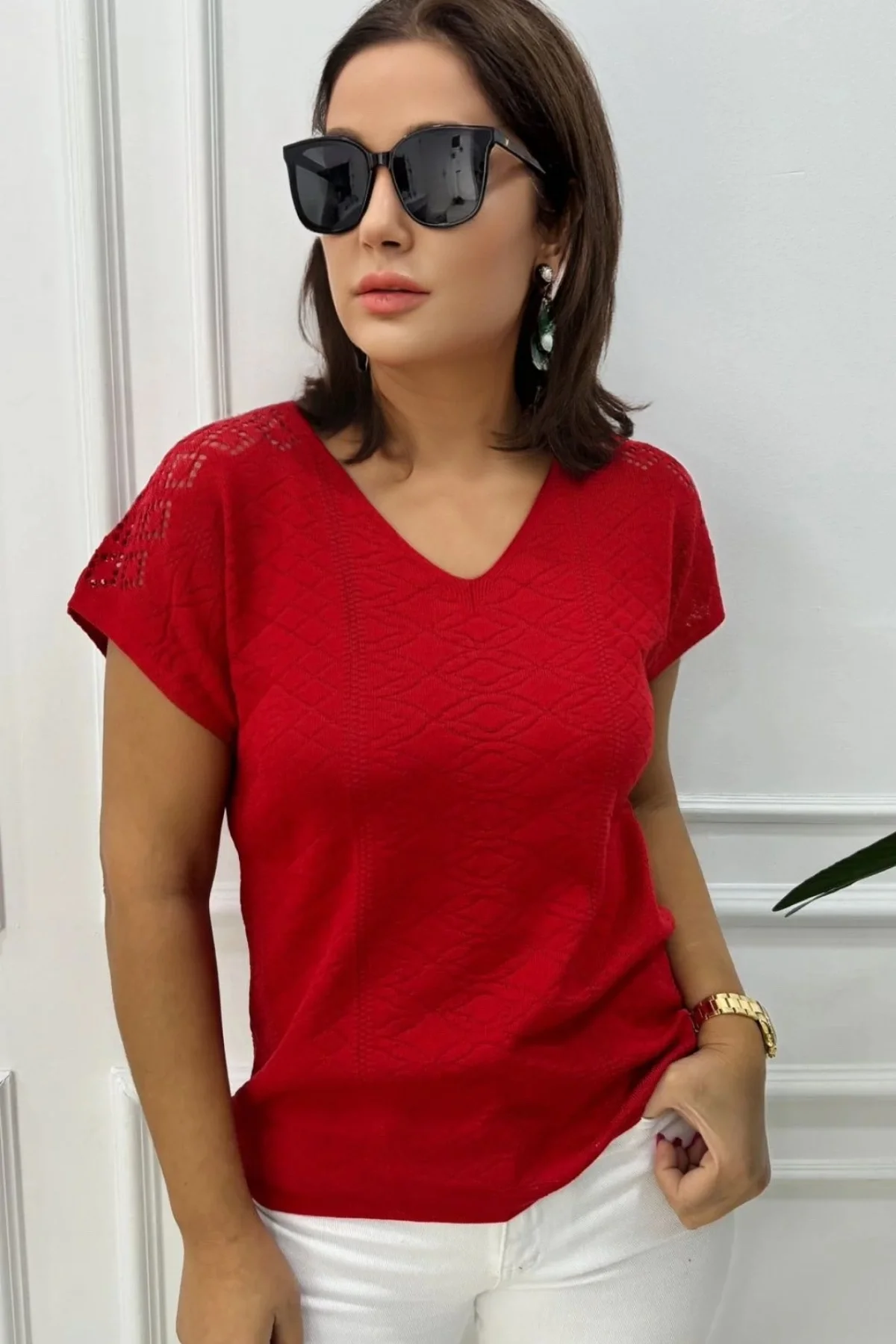 Kadın Kırmızı V Yaka Ajurlu Soğuk İplik Merserize Likralı Bluz