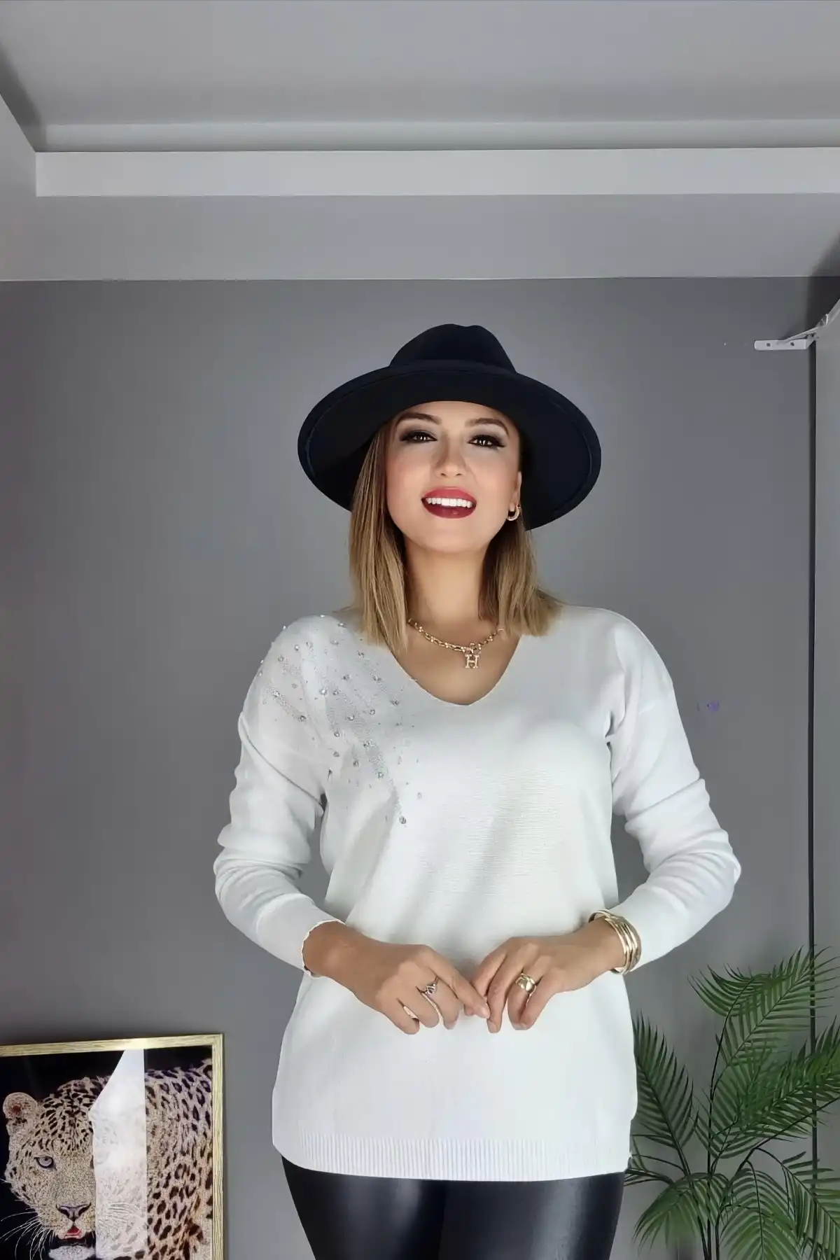 Kadın Beyaz V Yaka Omzu Kristal İnci Ve Taş İşlemeli Likralı Tiriko Kazak Bluz