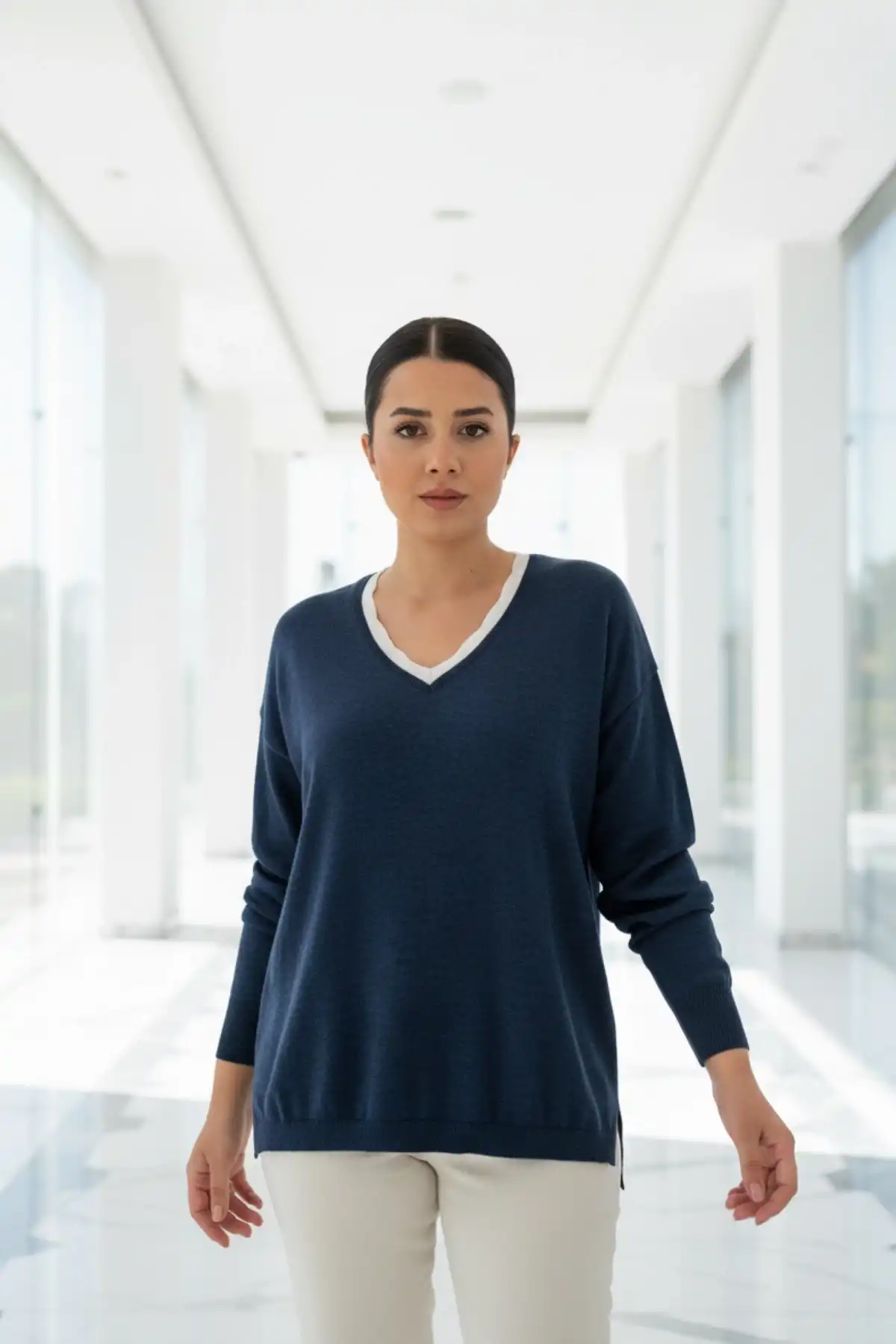 Kadın Lacivert V Yaka Yakası Çift Renkli Pamuk Örgü Likarlı İnce Triko Buluz