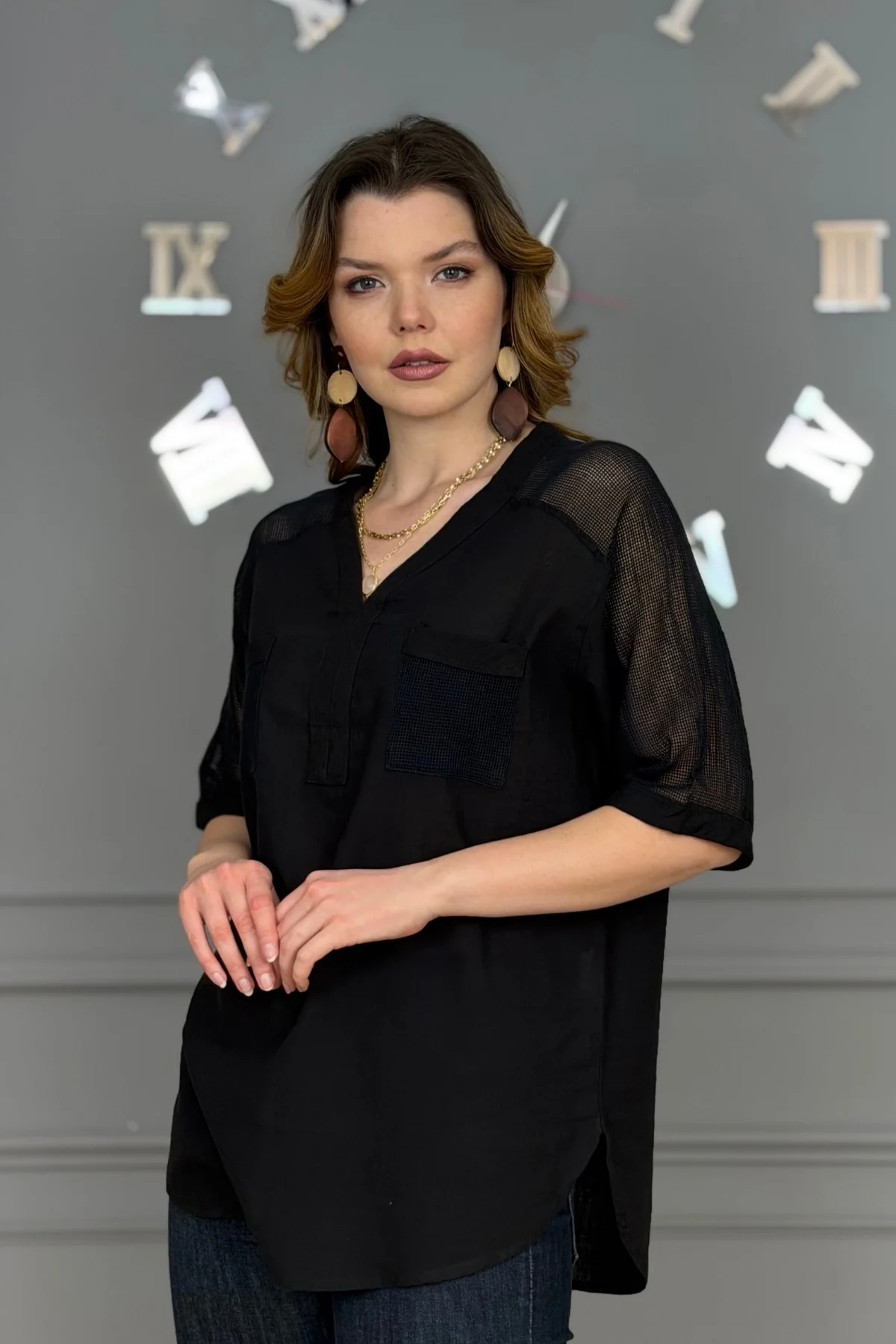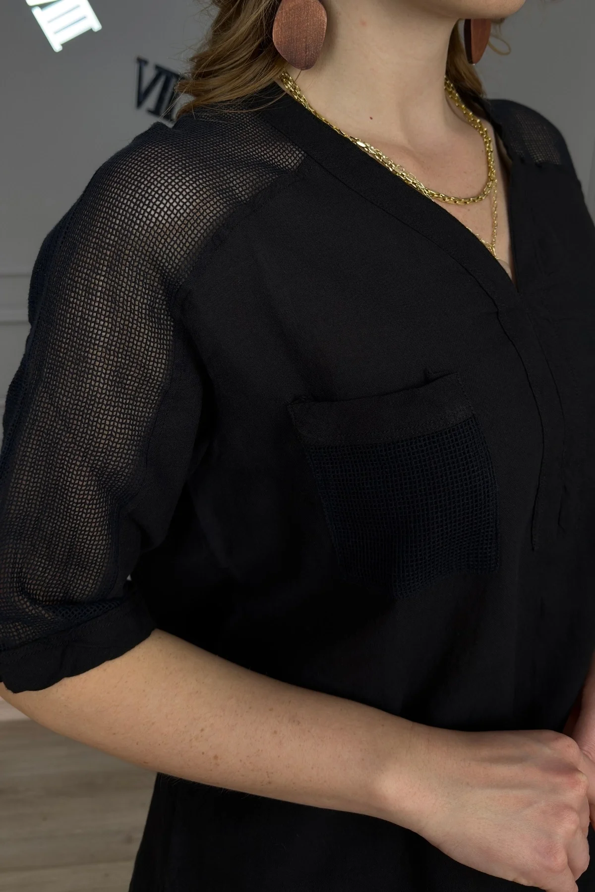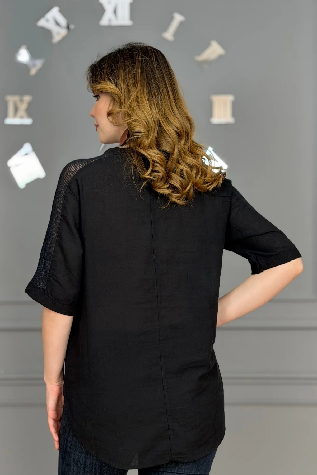 Kadın SİYAH Yıkamalı Organik Pamuk Keten Kumaş Omuz Ve Cebi File Detaylı Dirsek Kol TUNİK Gömlek