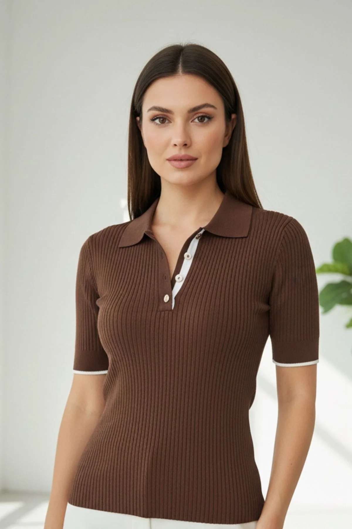 Kadın Kahve Polo Yaka Çıtçıtlı Yarım Patlı Likralı İnce Tiriko Bluz