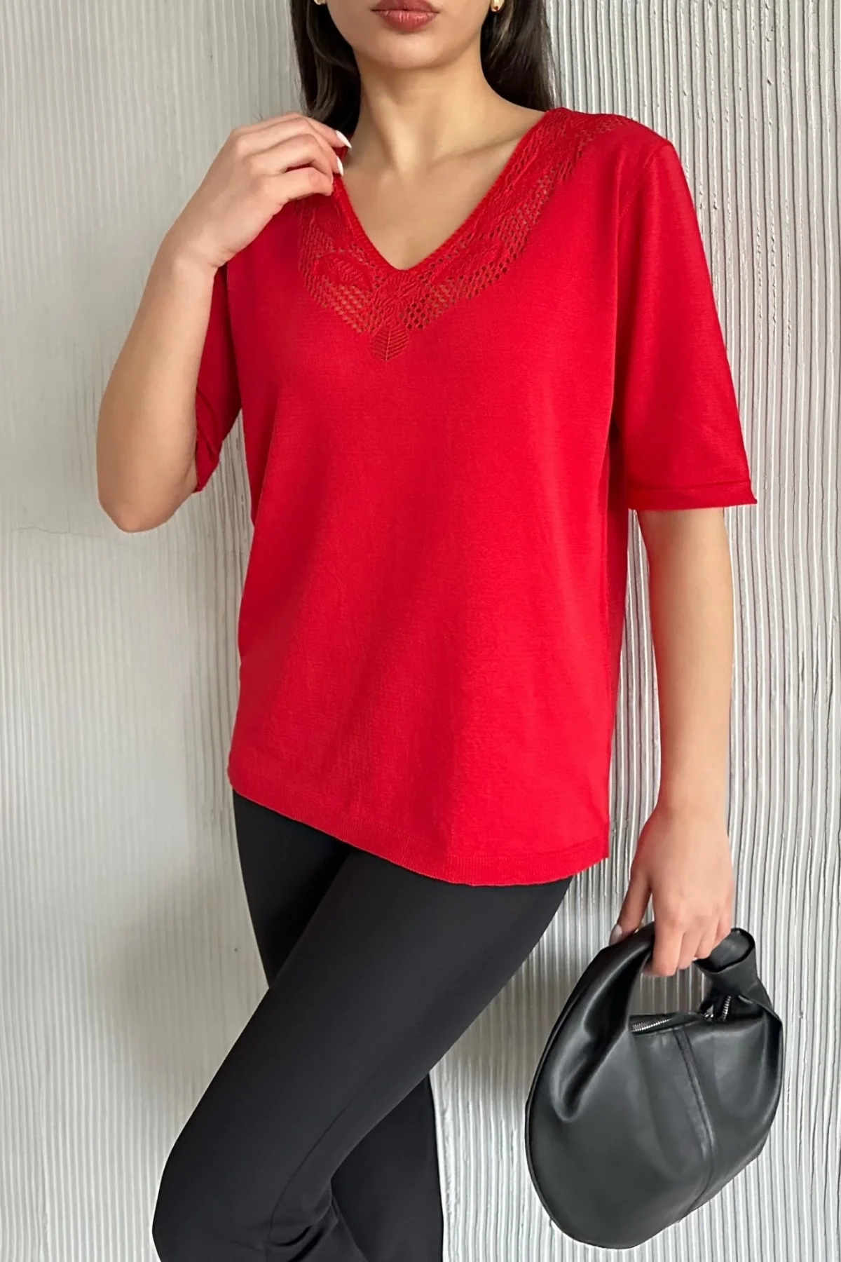 Kadın Kırmızı V Yaka Yakası Sim Detaylı Soğuk İplik Yazlık İnce Merserize Buluz