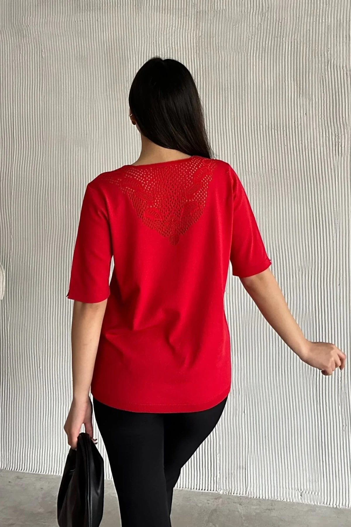 Kadın Kırmızı V Yaka Yakası Ve Sırtı Detaylı Soğuk İpilik Merserize Likralı Buluz