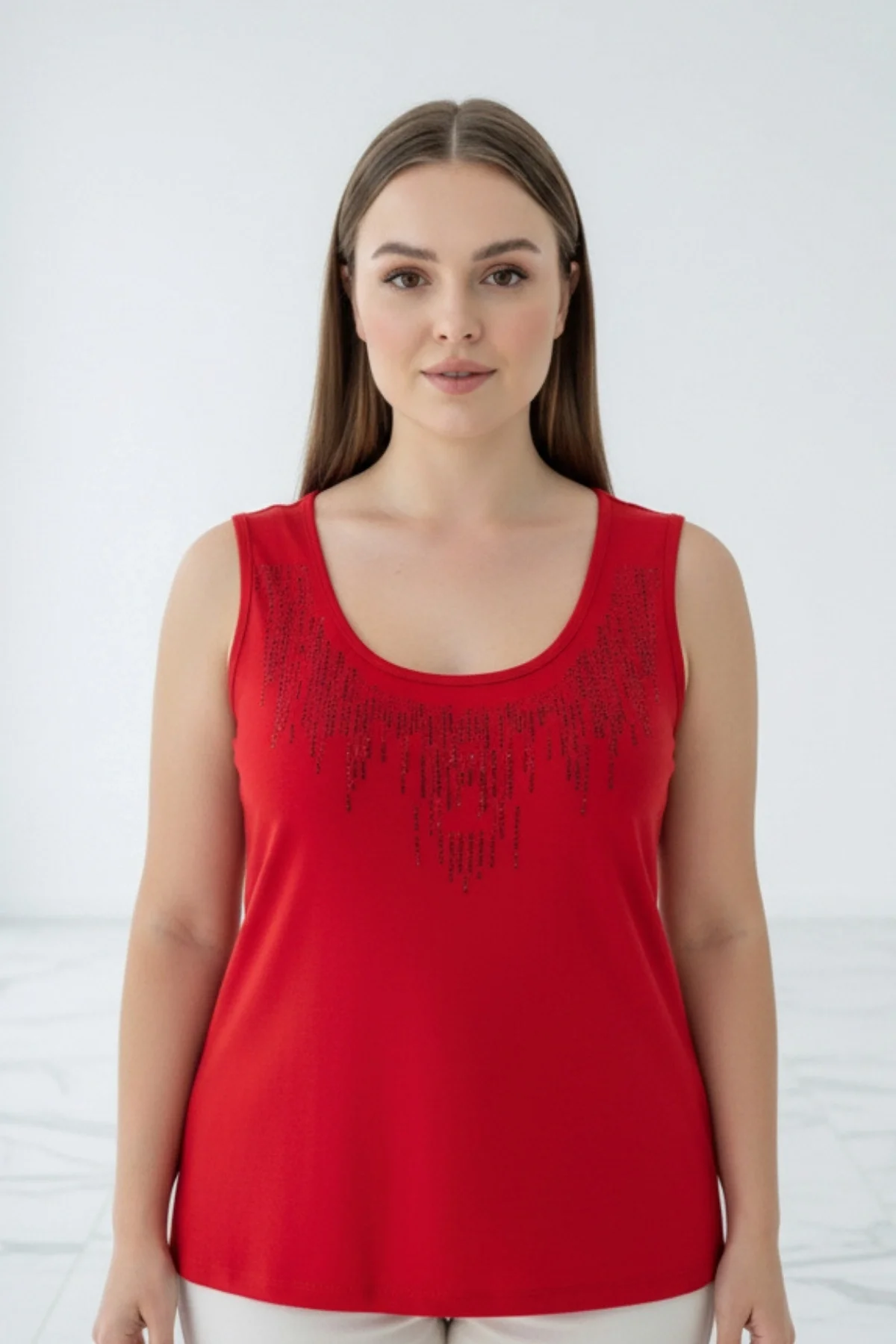 Kadın Kırmızı U Yaka Büyük Beden Yakası Taş İşlemeli Likralı Buluz