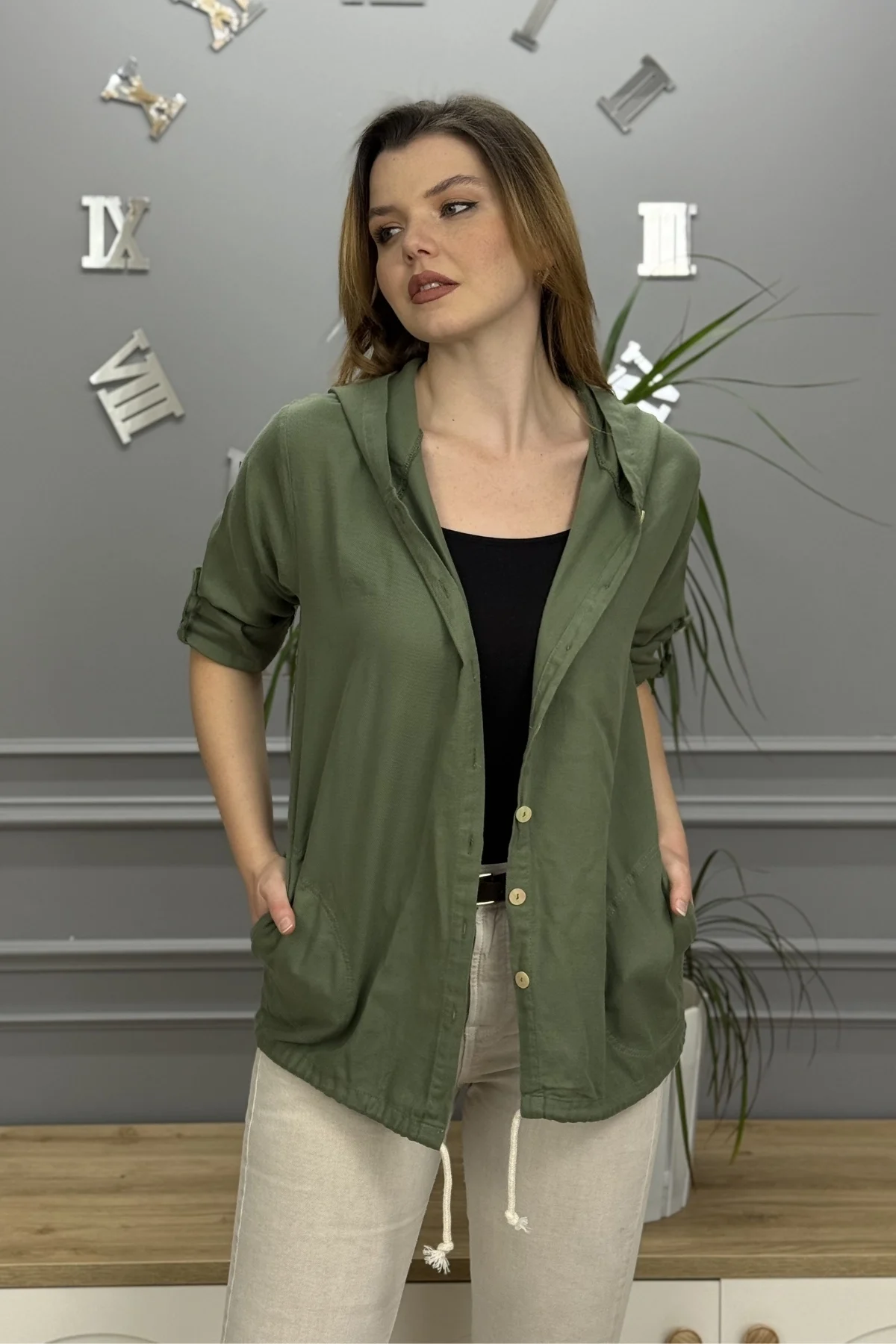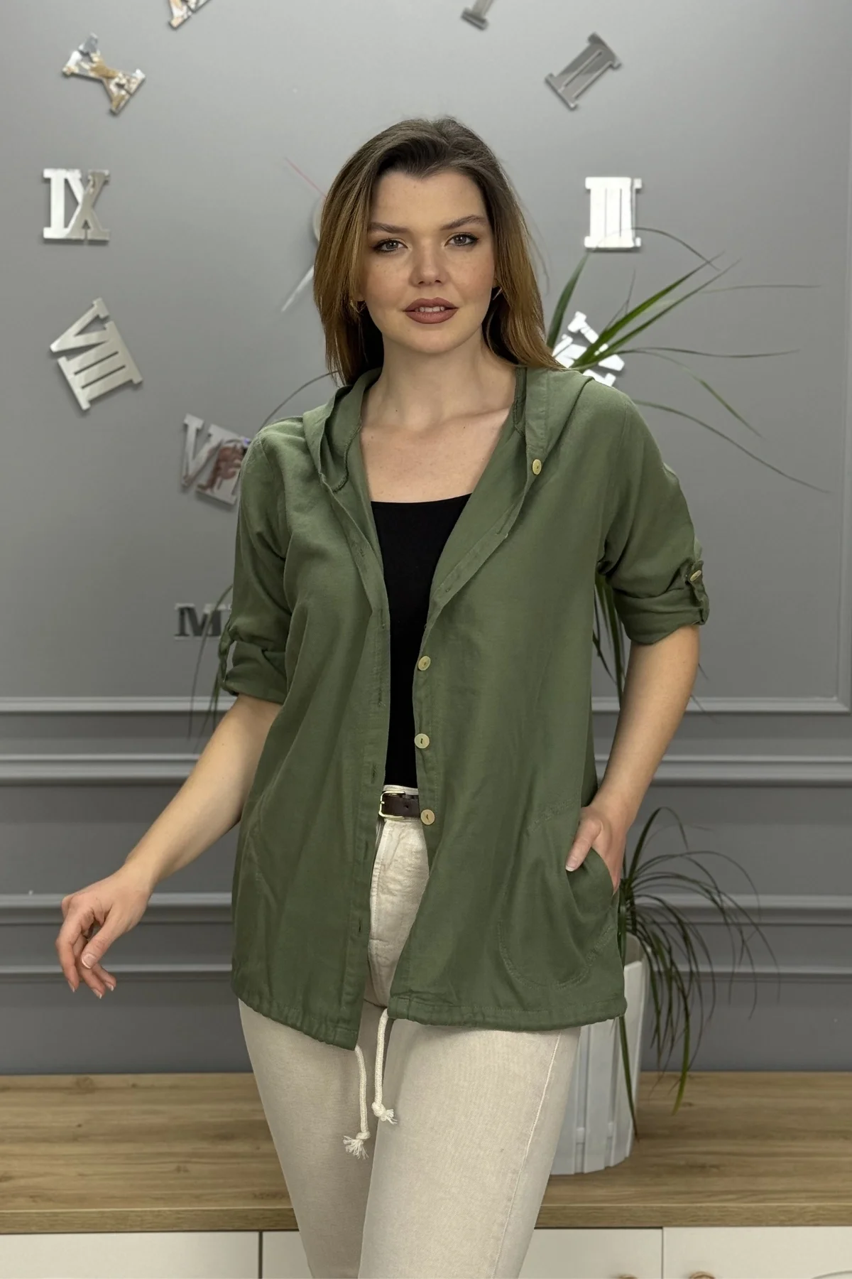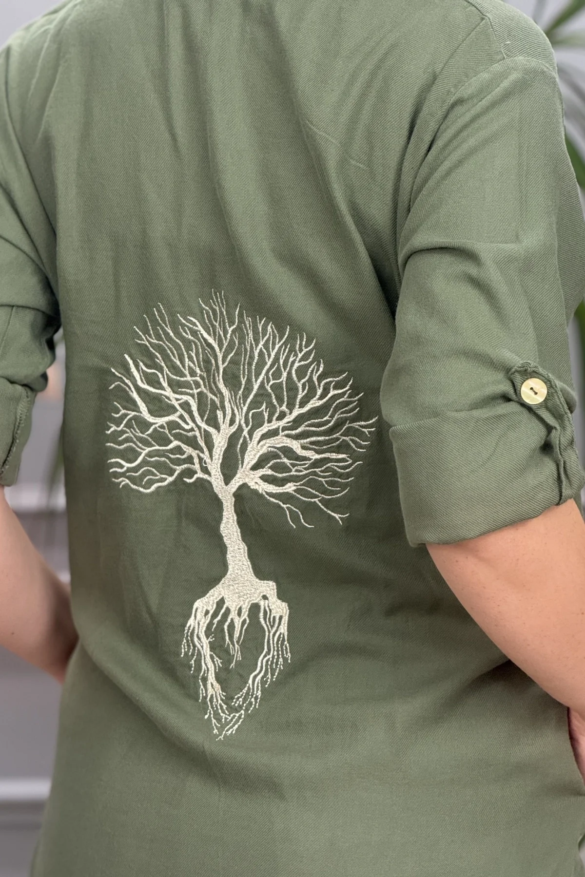 Kadın Haki Yeşil Kapüşonlu Sırtı Hayat Ağacı Nakışlı Pamuk Keten Kumaş Katlamalı Uzun Kol Gömlek Ceket