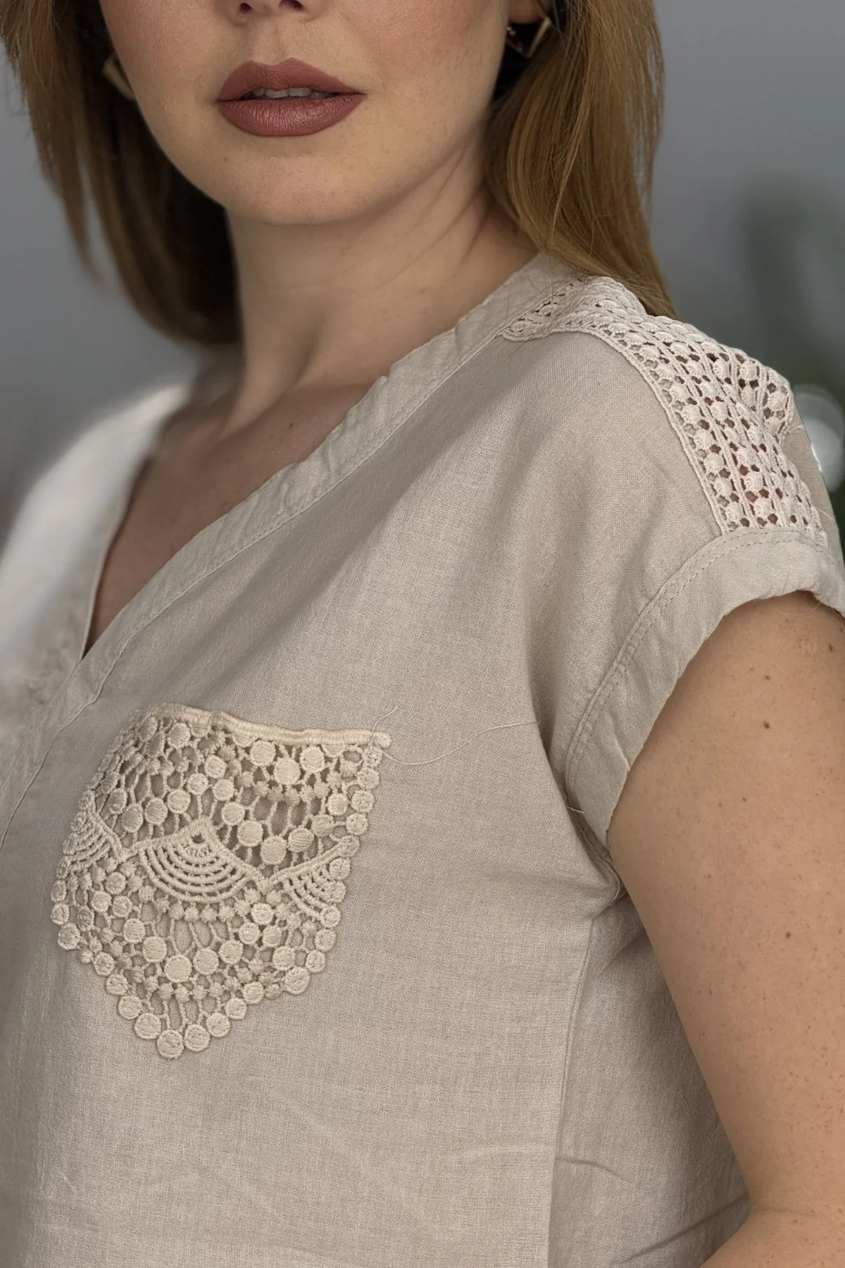 Kadın BEJ rengi Omzu Ve Cebi Güpürlü Keten Kumaş Kısa Kol Buluz Gömlek