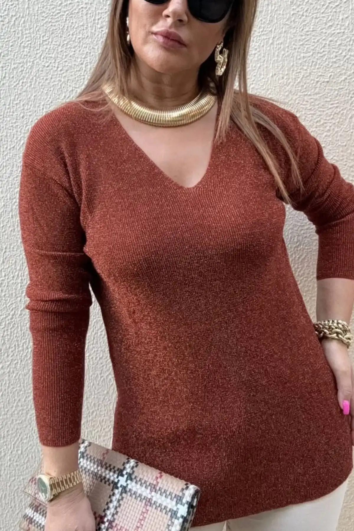 Kadın Bakır V Yaka Likralı Dışı Simli İçi Yumoş İnce Triko Bluz