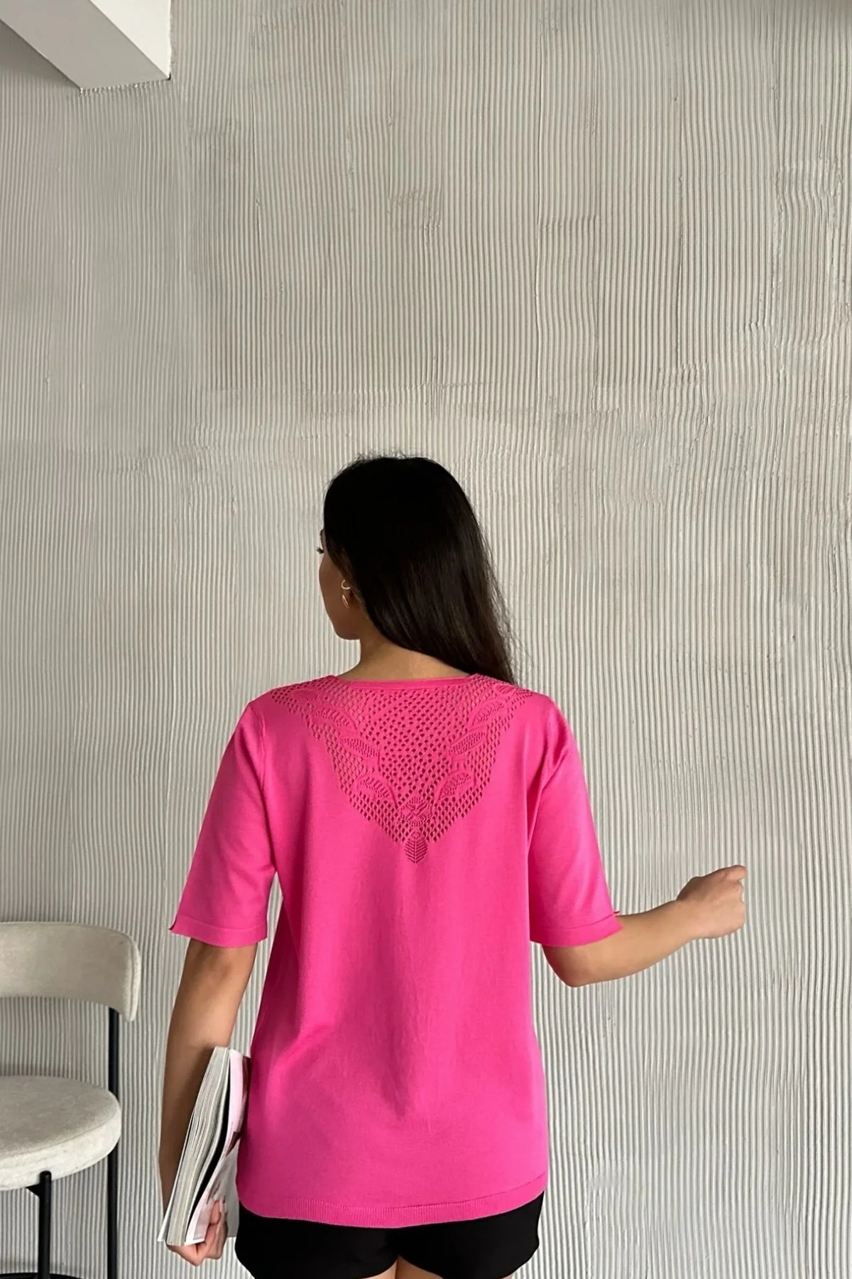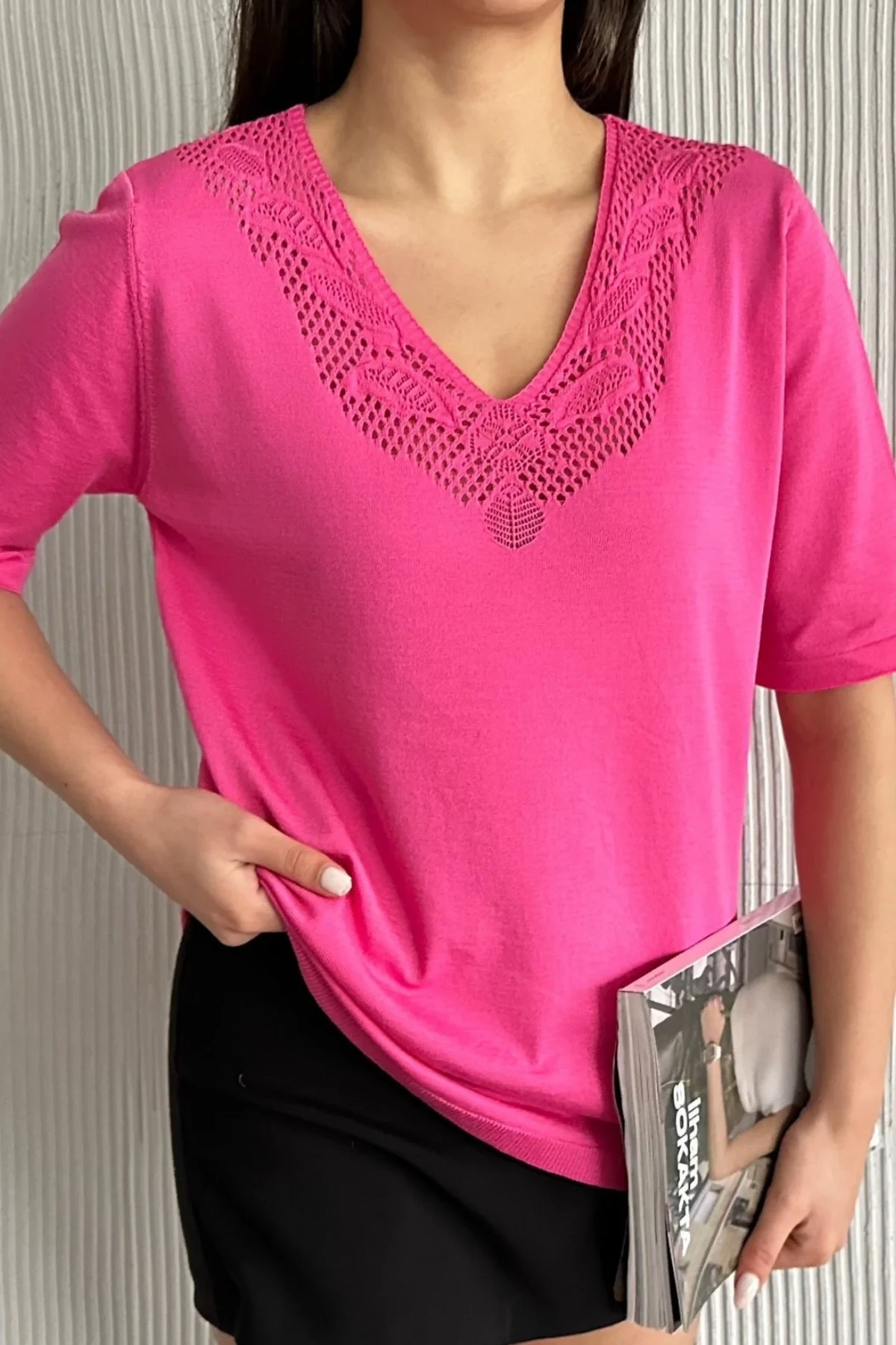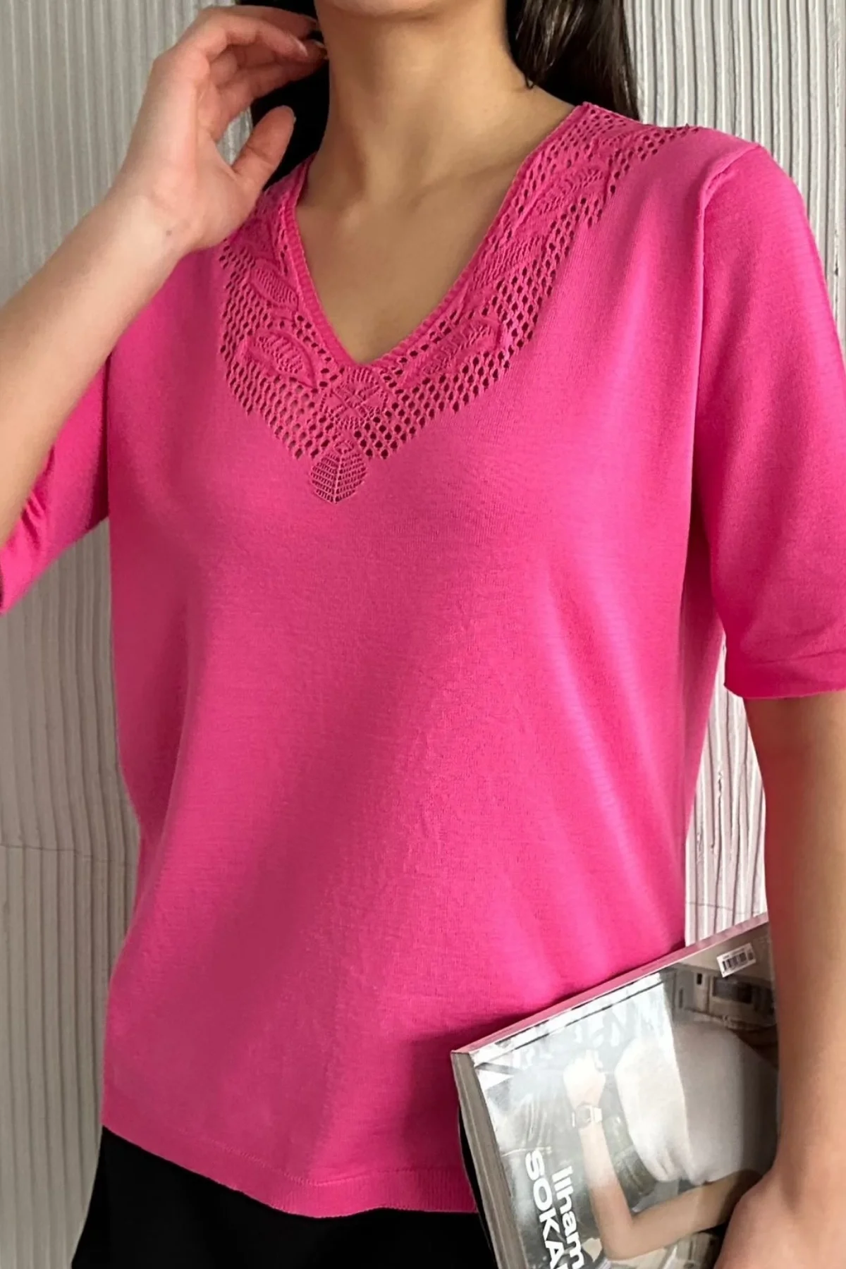 Kadın Pembe V Yaka Yakası Ve Sırtı Detaylı Soğuk İpilik Merserize Likralı Buluz