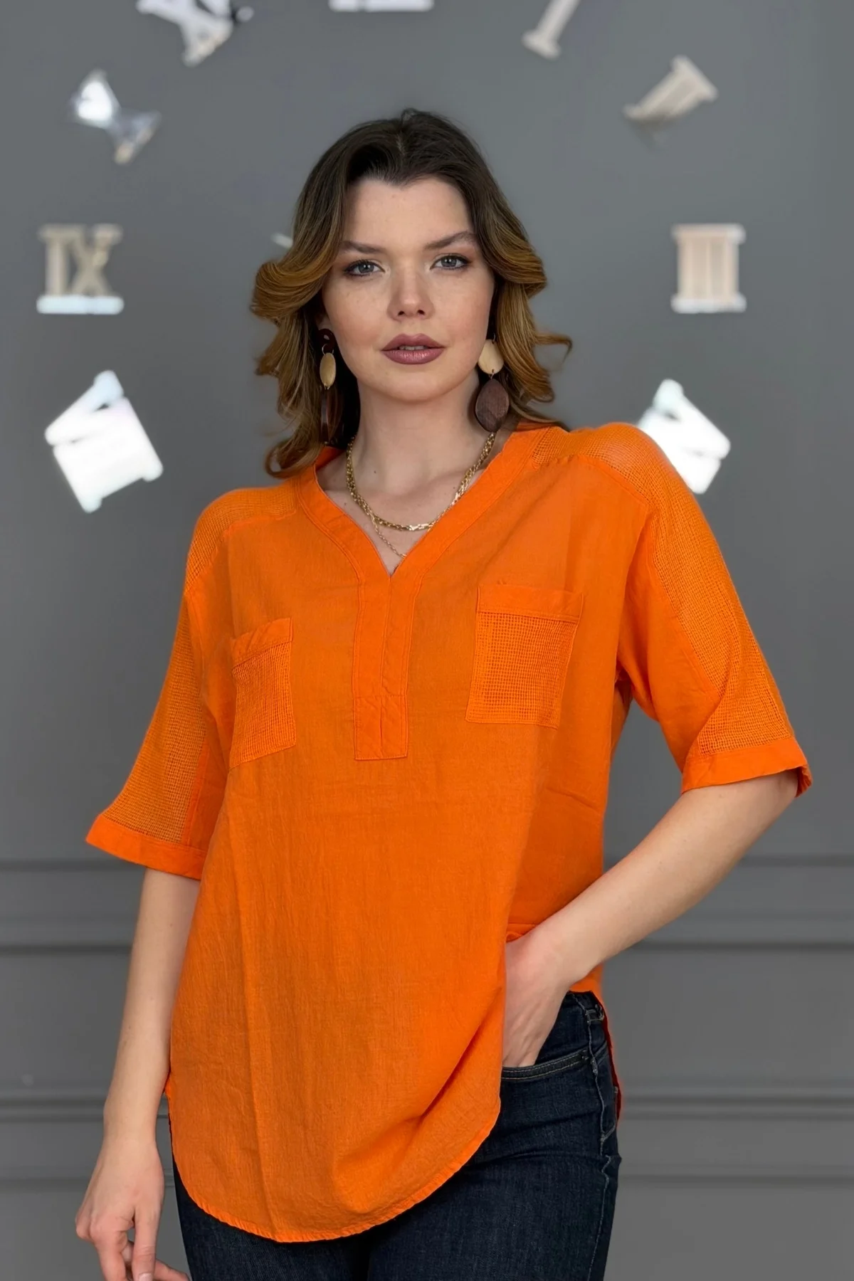 Kadın TURUNCU Yıkamalı Organik Pamuk Keten Kumaş Omuz Ve Cebi File Detaylı Dirsek Kol TUNİK Gömlek