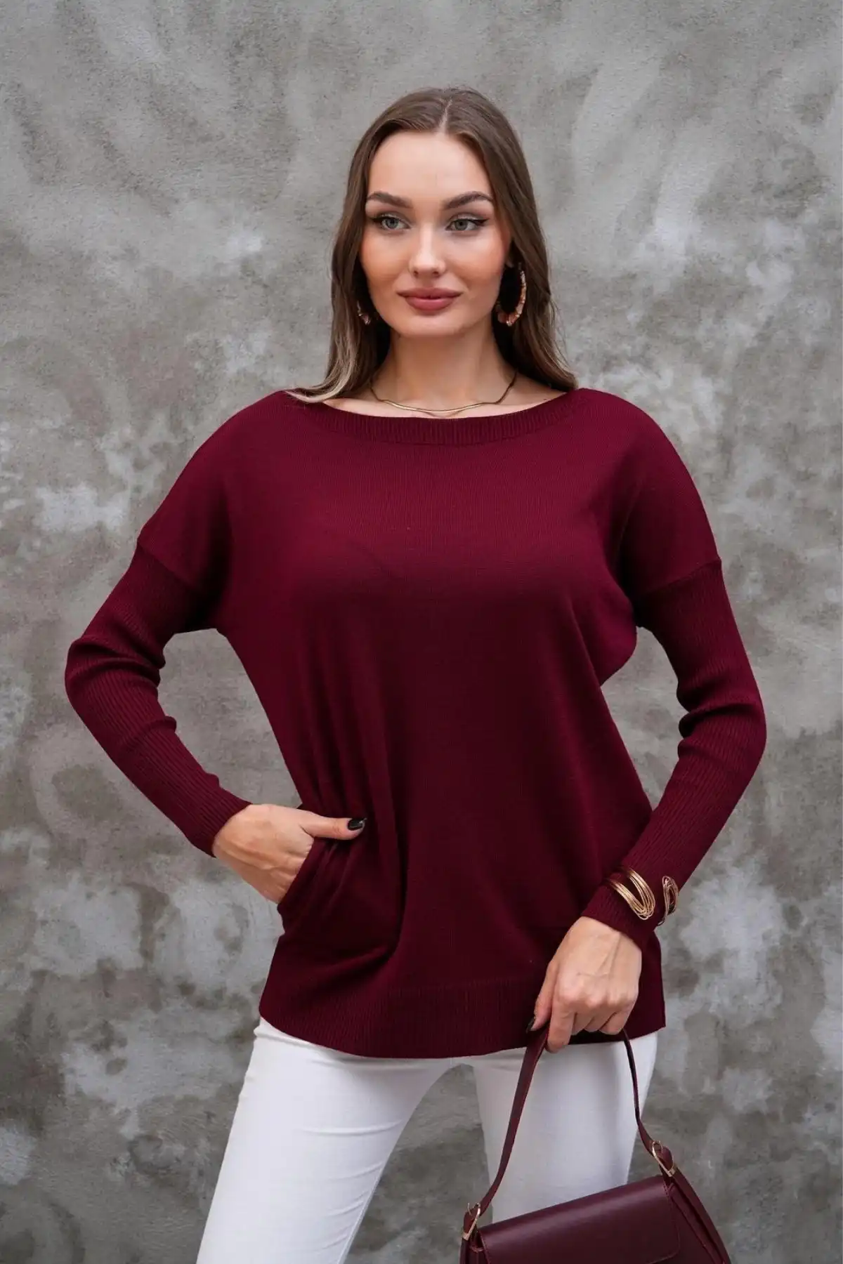 Kadın Bordo Bisiklet Yaka Yandan Cepli Likralı Esnek Yumuşak Dokulu Triko Bluz