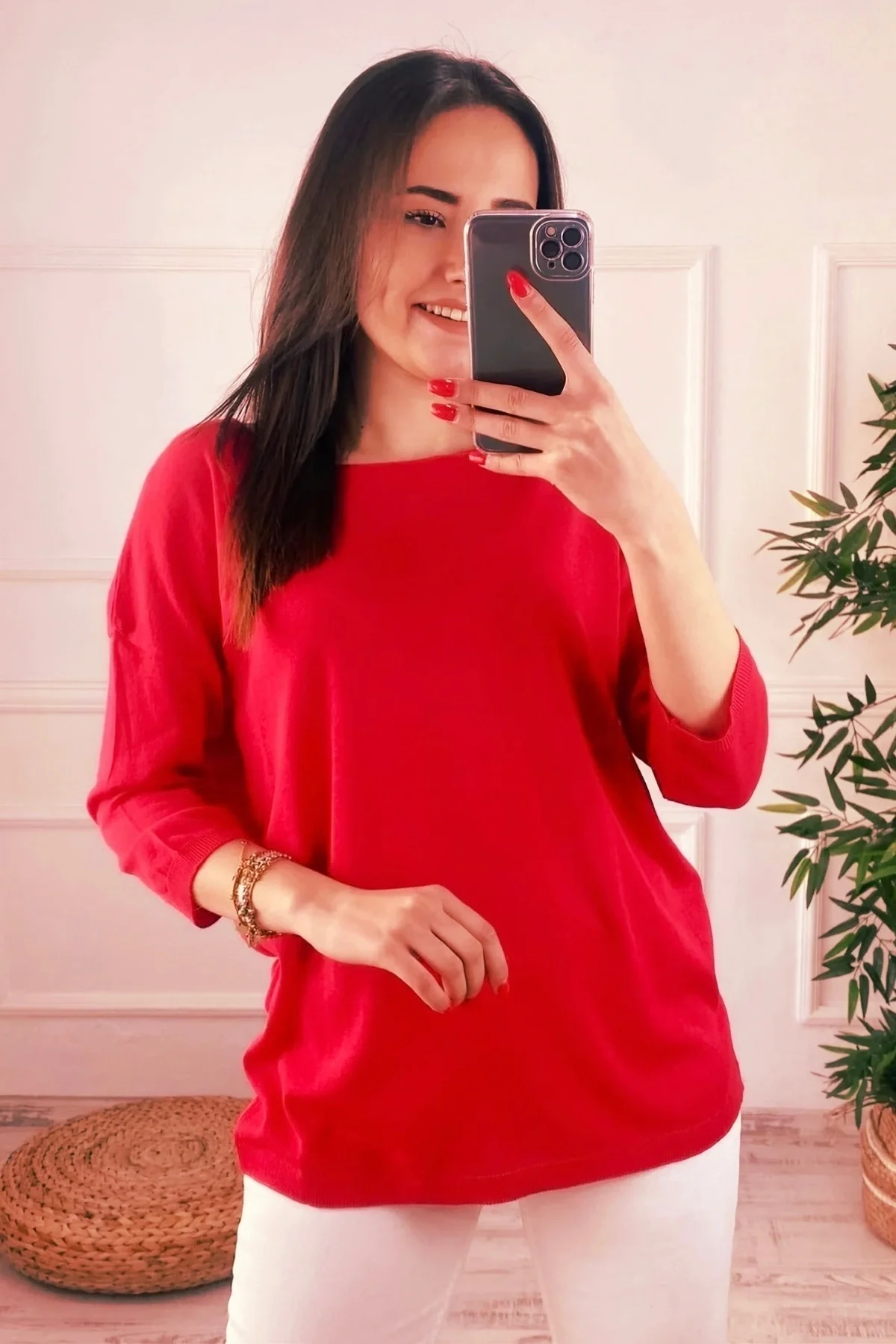 Kadın KIRMIZI Bisiklet Yaka Yandan Cepli Likralı Yumuşak Dokulu İnce Tiriko Kazak