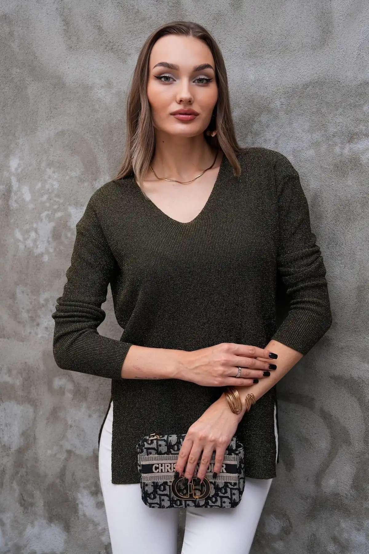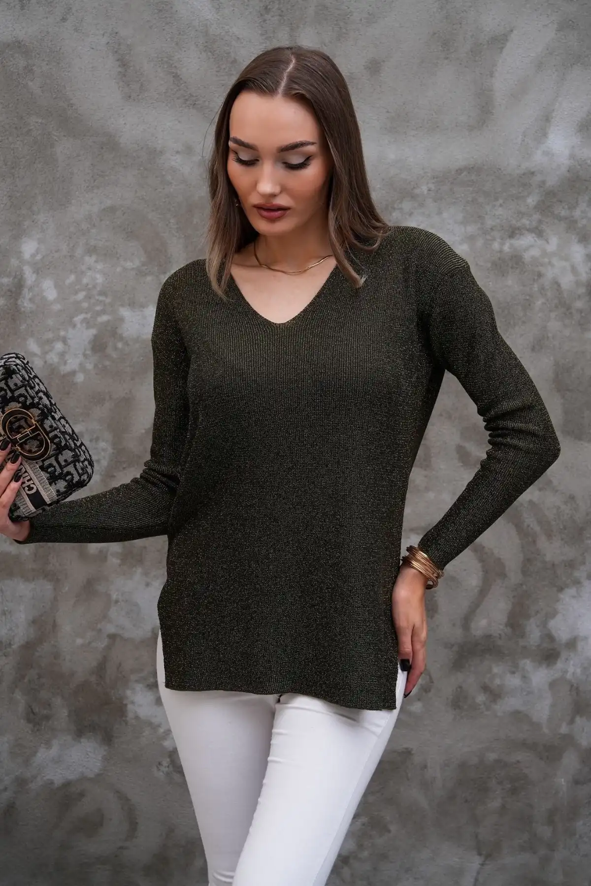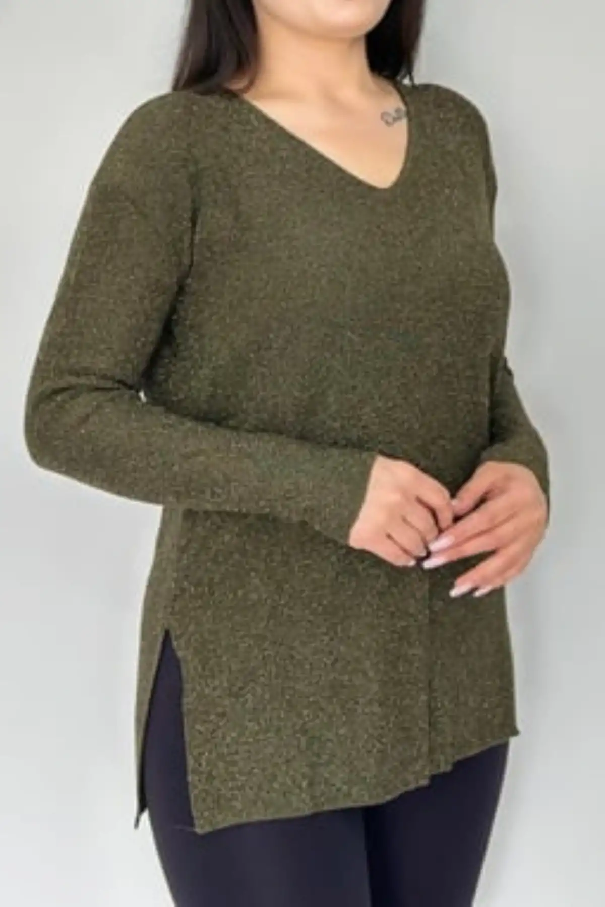 Kadın Haki Yeşil V Yaka Likralı Dışı Simli İçi Yumoş İnce Triko Bluz