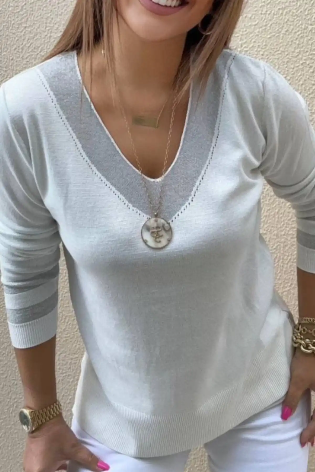 Kadın Beyaz V Yaka Yakası Ve Kolu GIRİ Simli Likralı İthal İp Örgü İnce Tiriko Kazak