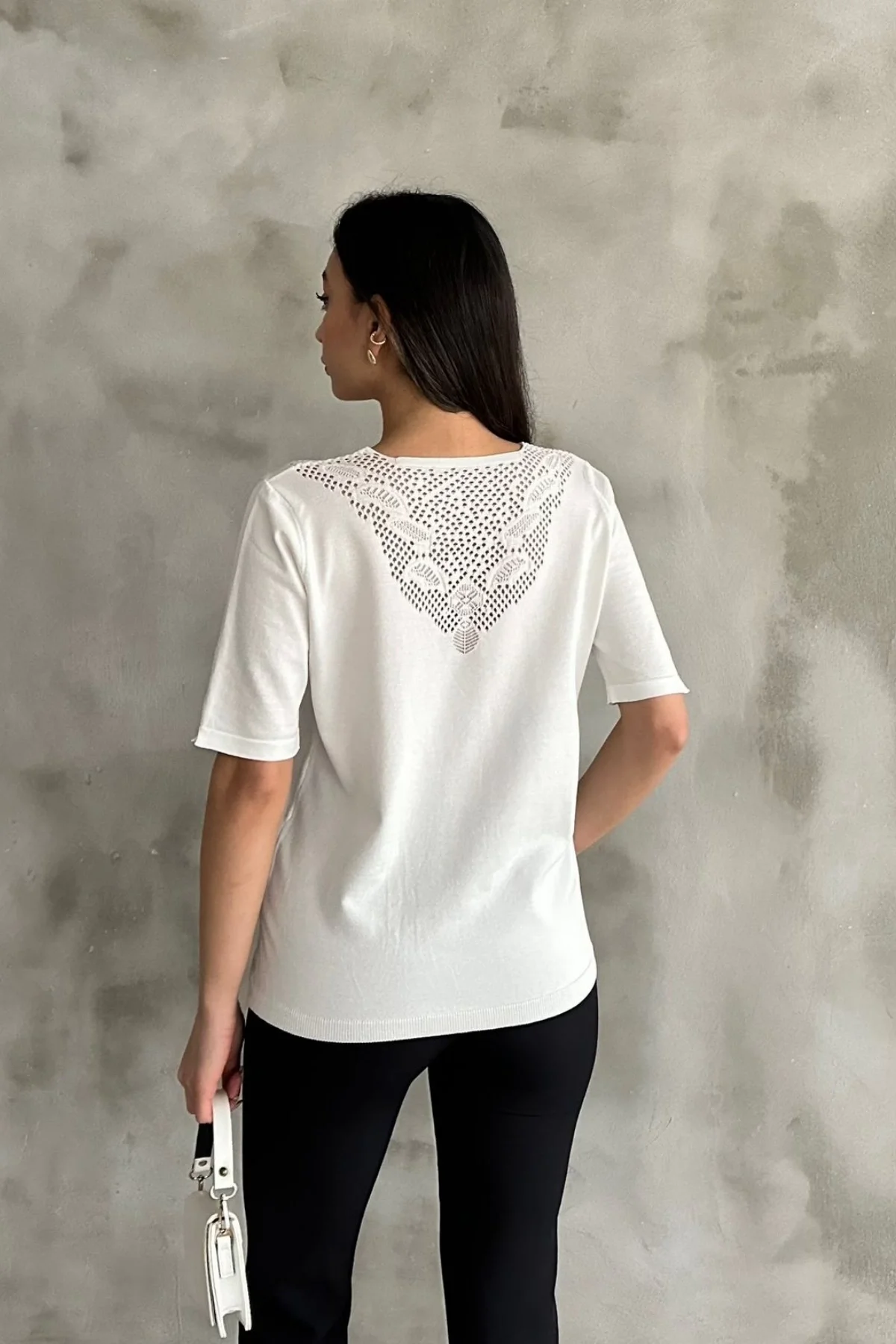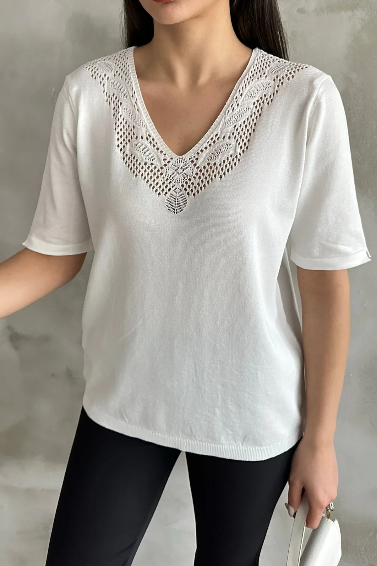Kadın Beyaz V Yaka Yakası Sim Detaylı Soğuk İplik Yazlık İnce Merserize Buluz