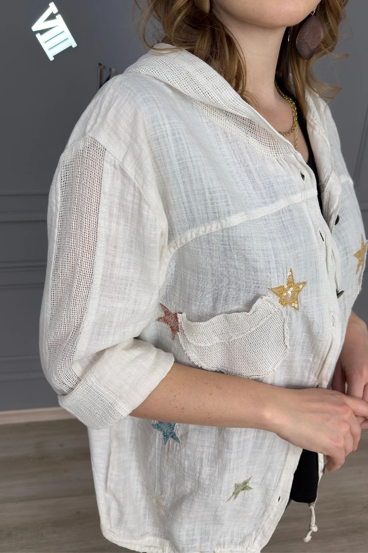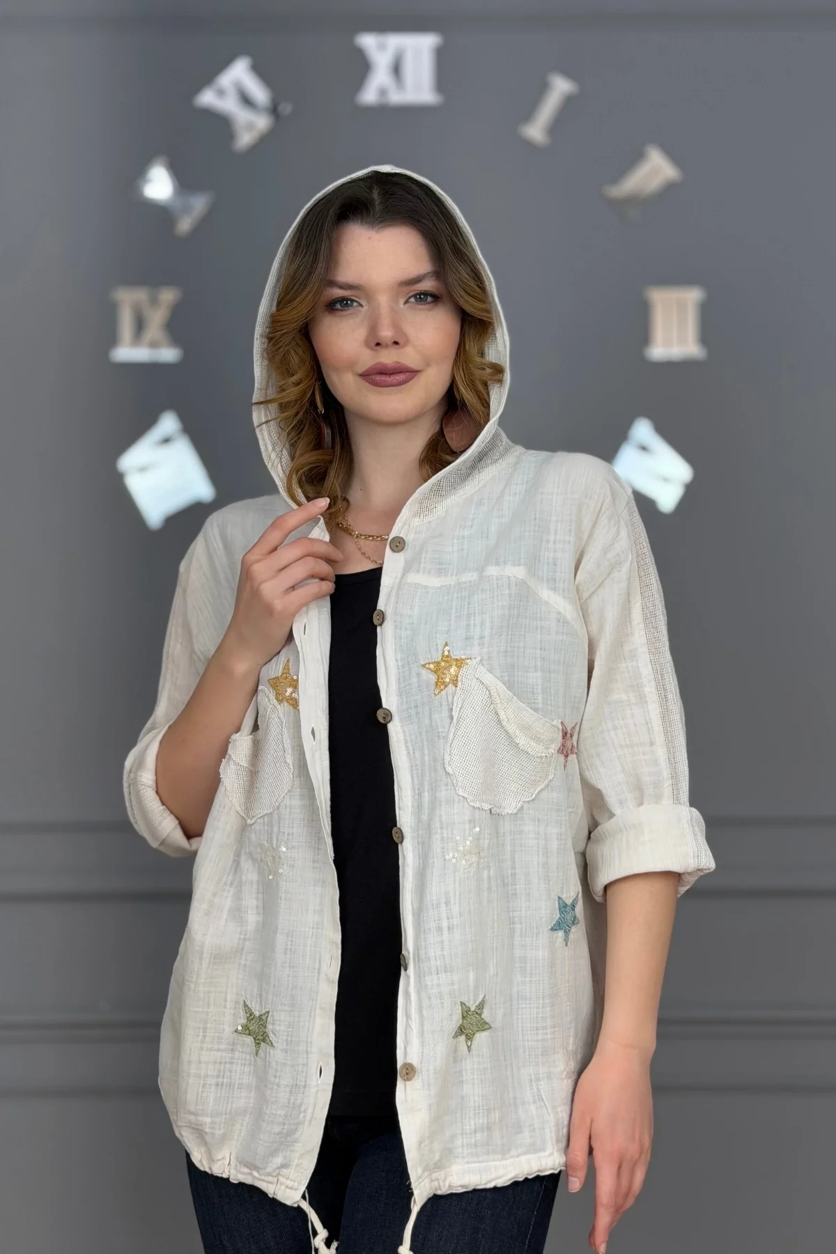 Kadın BEYAZ Organik Yıkamalı Keten Kumaş Arkası Pamuk Penye Kapüşonlu File Ve Yıldız Pul Nakışlı Gömlek Ceket