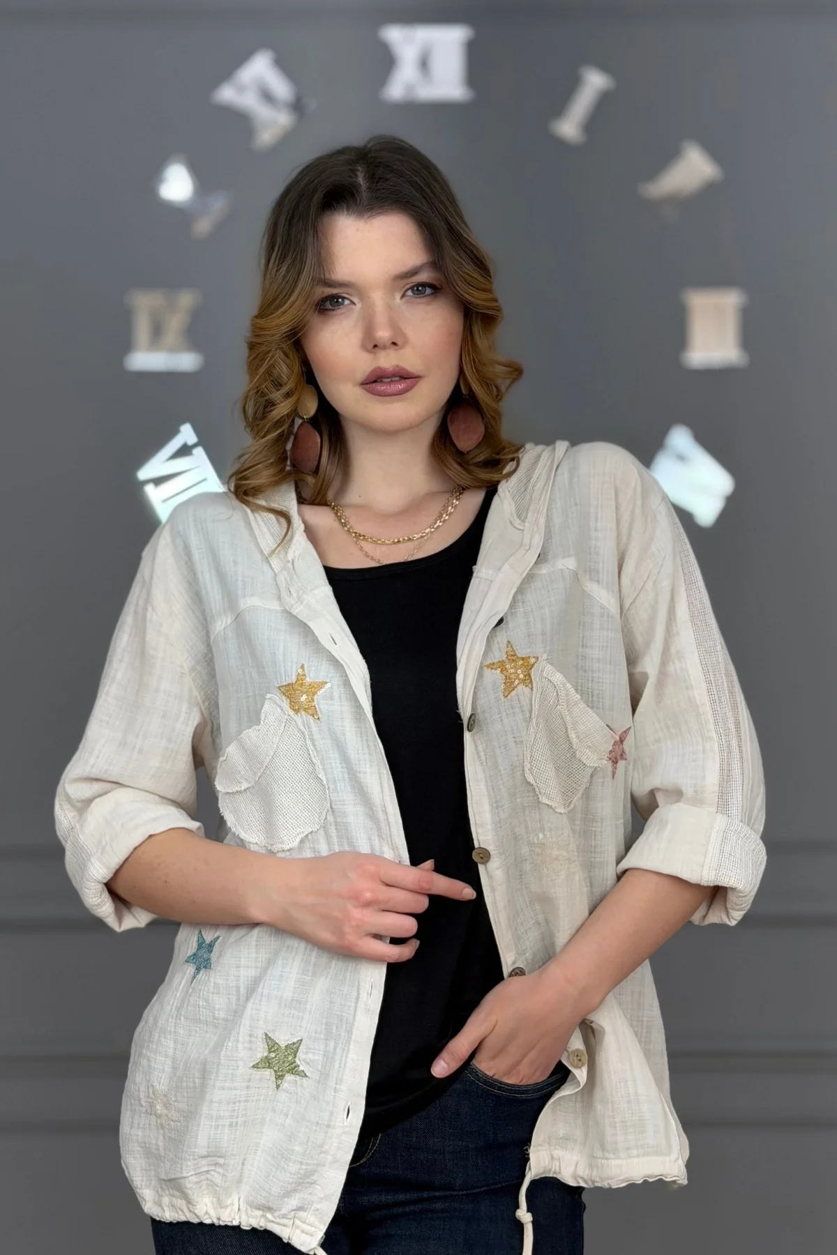 Kadın TAŞ RENGİ Organik Yıkamalı Keten Kumaş Arkası Pamuk Penye Kapüşonlu File Ve Yıldız Pul Nakışlı Gömlek Ceket