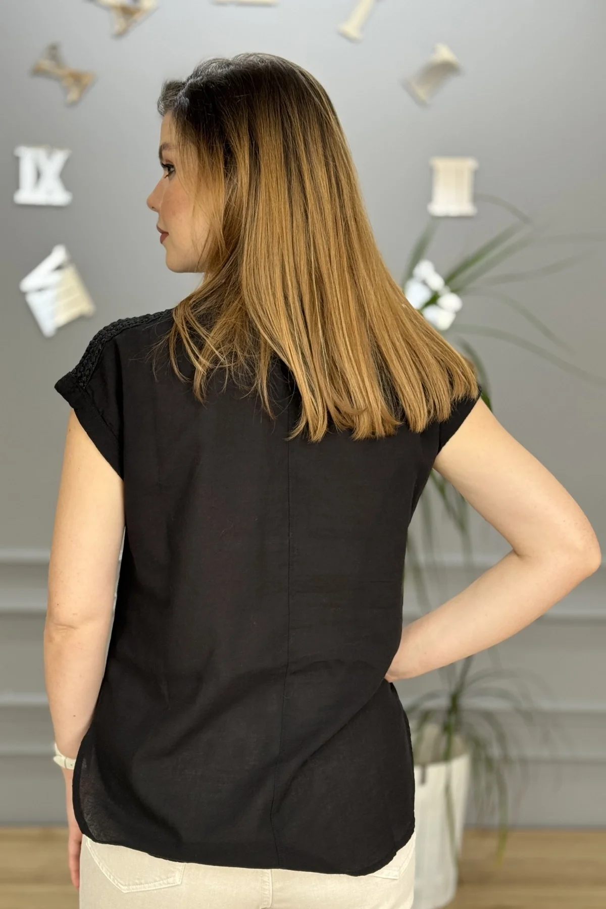 Kadın Siyah Omzu Ve Cebi Güpürlü Keten Kumaş Kısa Kol Buluz Gömlek