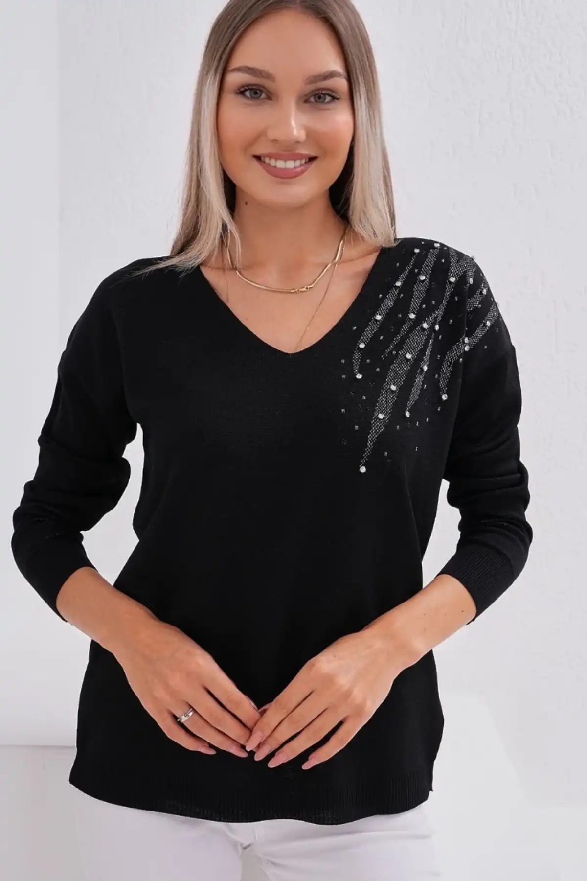 Kadın Siyah V Yaka Omzu Kristal İnci Ve Taş İşlemeli Likralı Tiriko Kazak Bluz
