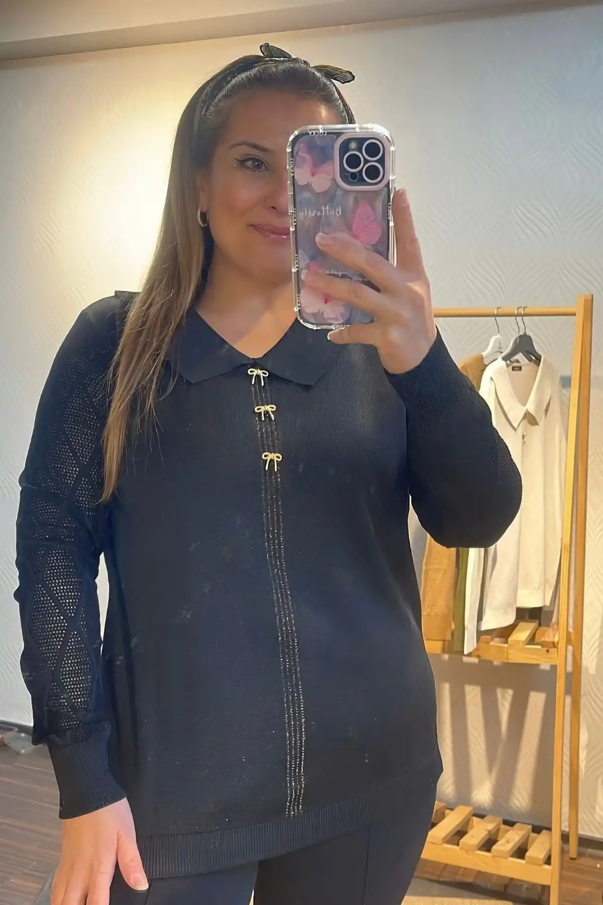 Kadın Siyah Bebe Yakalı Kollar Ajurlu Fileli Simli Likralı Yumuşak Dokulu İnce Tiriko Kazak
