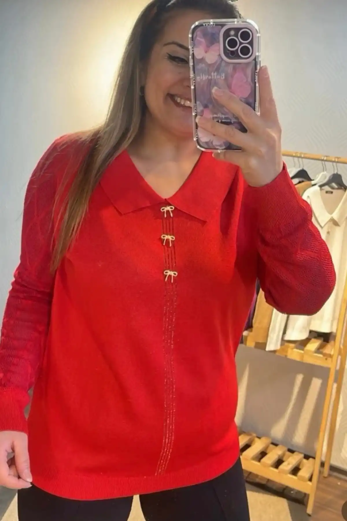 Kadın Kırmızı Bebe Yakalı Kollar Ajurlu Fileli Simli Likralı Yumuşak Dokulu İnce Tiriko Kazak