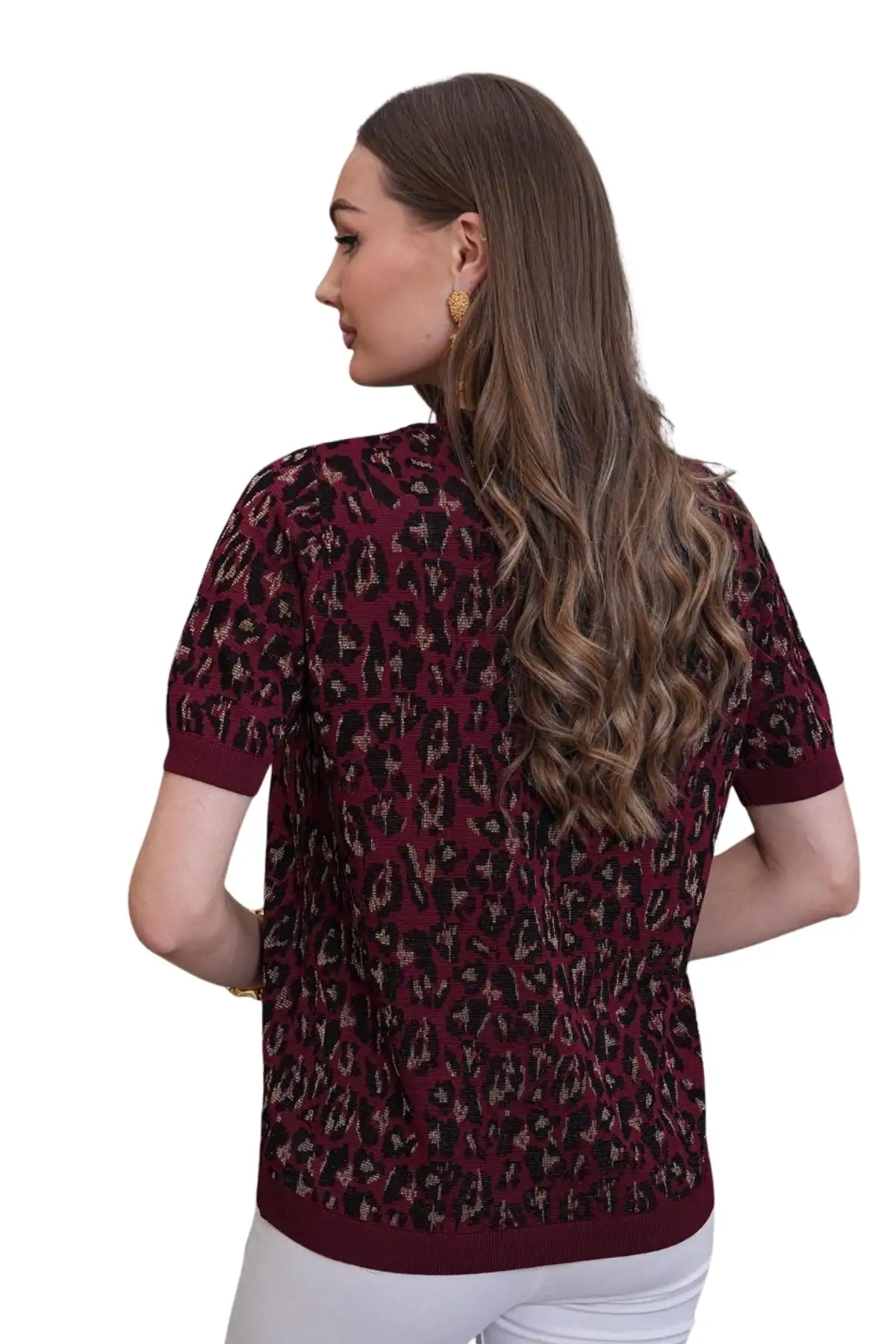 Kadın BORDO Bisiklet Yaka Leopar Desenli Likralı Yumuşak Dokulu Kısakol Tiriko Buluz